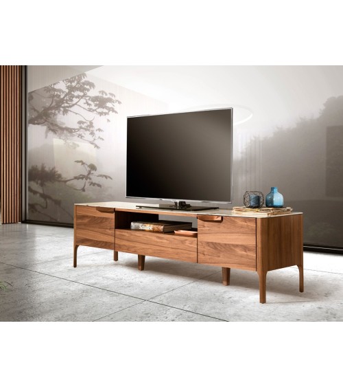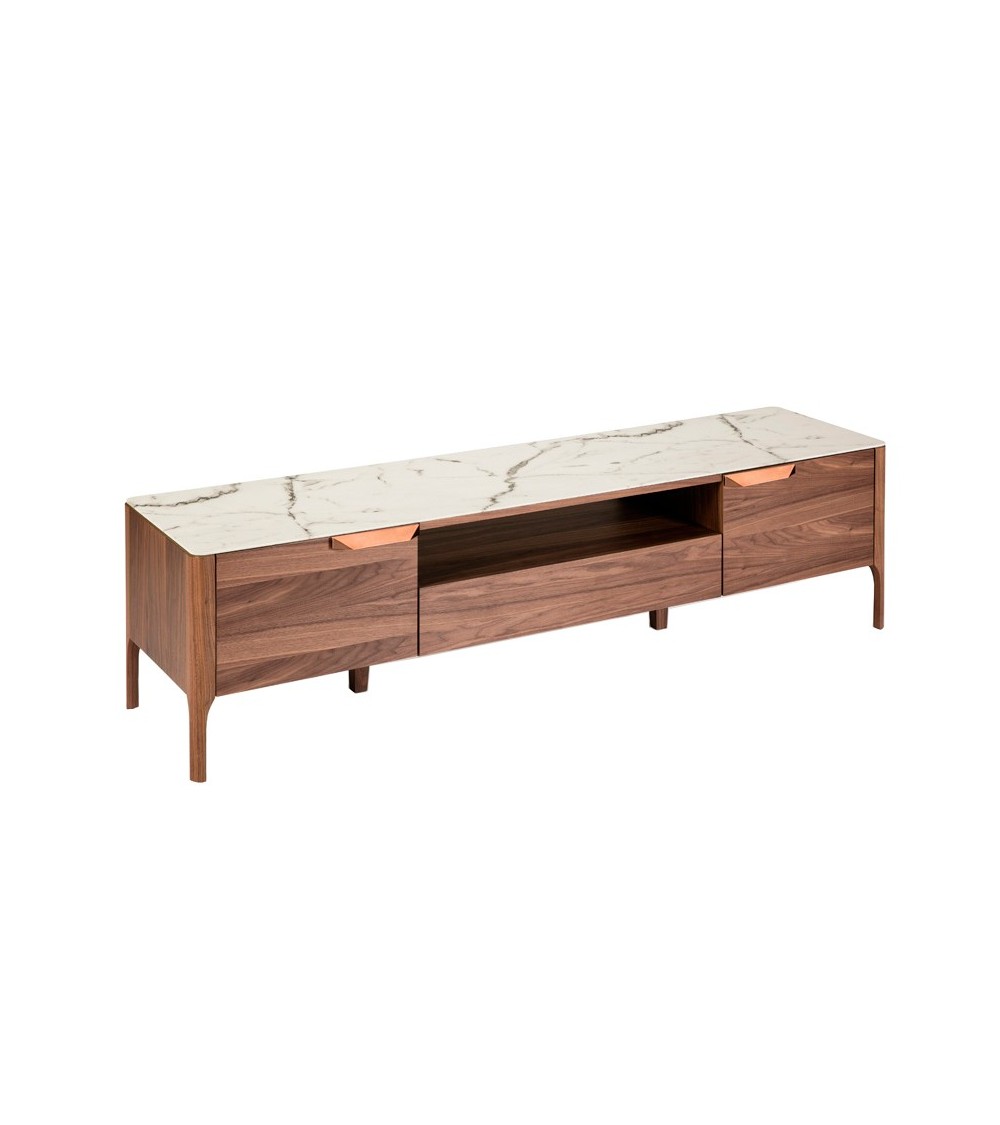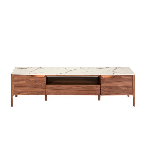 Produit à usages professionnels et particuliers. Meuble TV en fibre de verre effet marbre et noyer modèle 3078 Angel Cerdá S.L. Meuble TV au design moderne en bois plaqué noyer naturel d'une épaisseur de 0,5 mm, avec un élégant plateau en verre imitation marbre Calacatta avec lequel vous obtiendrez le look sophistiqué que vous recherchez dans votre salon. Gardez tout à sa place grâce à son grand espace de rangement ouvert, son tiroir central avec système d'ouverture push et ses deux portes avec système de fermeture amortie. La touche différente et personnelle est offerte par ses poignées originales en acier couleur cuivre STYLE - Cet élégant meuble TV avec plateau en verre effet marbre apportera la touche sophistiquée, moderne et minimaliste que vous recherchez dans votre salon. MULTI USAGE - Polyvalent et fonctionnel, son design lui permet de s'intégrer dans n'importe quel espace, et se combine parfaitement avec les dernières tendances en matière de décoration. DÉCORATION ET CONFORT - Avec des lignes droites et simples, ce meuble TV en noyer et un plateau similaire au marbre blanc calacatta, combinés avec des poignées originales en acier couleur cuivre, seront parfaits pour apporter cette touche de style et de sophistication que vous recherchez, tout en côté fonctionnalité et praticité. FONCTIONNALITÉ - Grâce aux dimensions de sa structure, ainsi qu'à son espace de rangement ouvert avec des portes et un tiroir avec un système de fermeture en douceur, ce meuble TV créera des tendances et de la personnalité, offrant également espace et chaleur à l'espace.GAMME PROFESSIONNELLE - A destination des architectes d'interieur, Bureaux, Commerces et événementiel, Hôtellerie, Restauration.