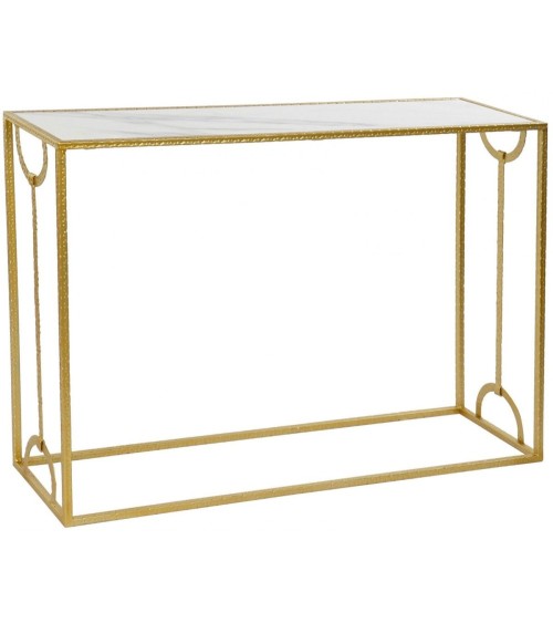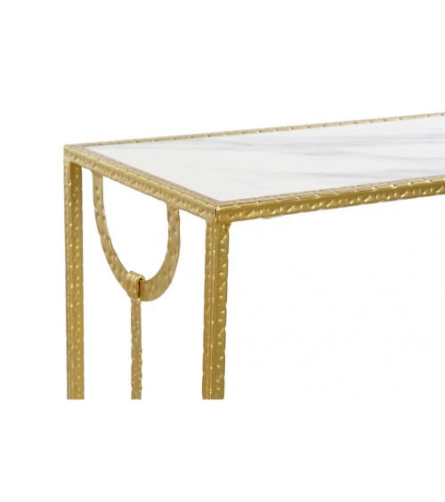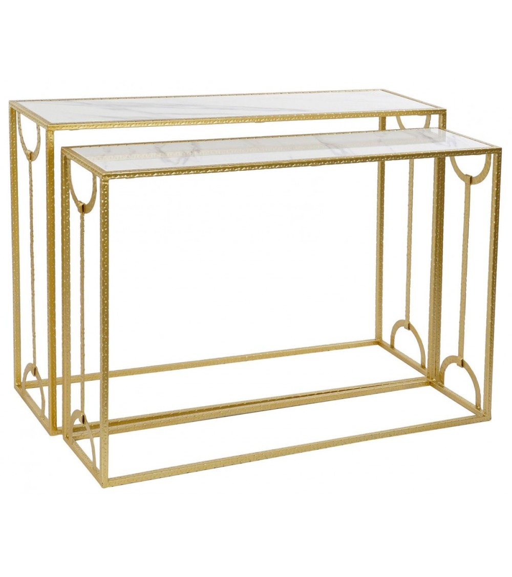 Set de 2 consoles avec structure en métal doré avec détails et plateaux en marbre blanc.Dimensions- Longueur 107.5cm x largeur 30.5cm x Hauteur 79cm et 110x32.5x83.5cmCouleur- Doré et blancMatière- Métal et marbre