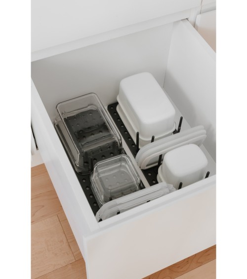 Customisez vos espaces de rangement de cuisine avec cet organiseur de tiroirs - 2 plaques avec allonges et 16 pics repositionnables. Créez vos rangements pour casseroles, assiettes, boites... Lot de 2 pièces Dimensions - 45 à 54.3 x 15 x 10 cm Matière - plastique