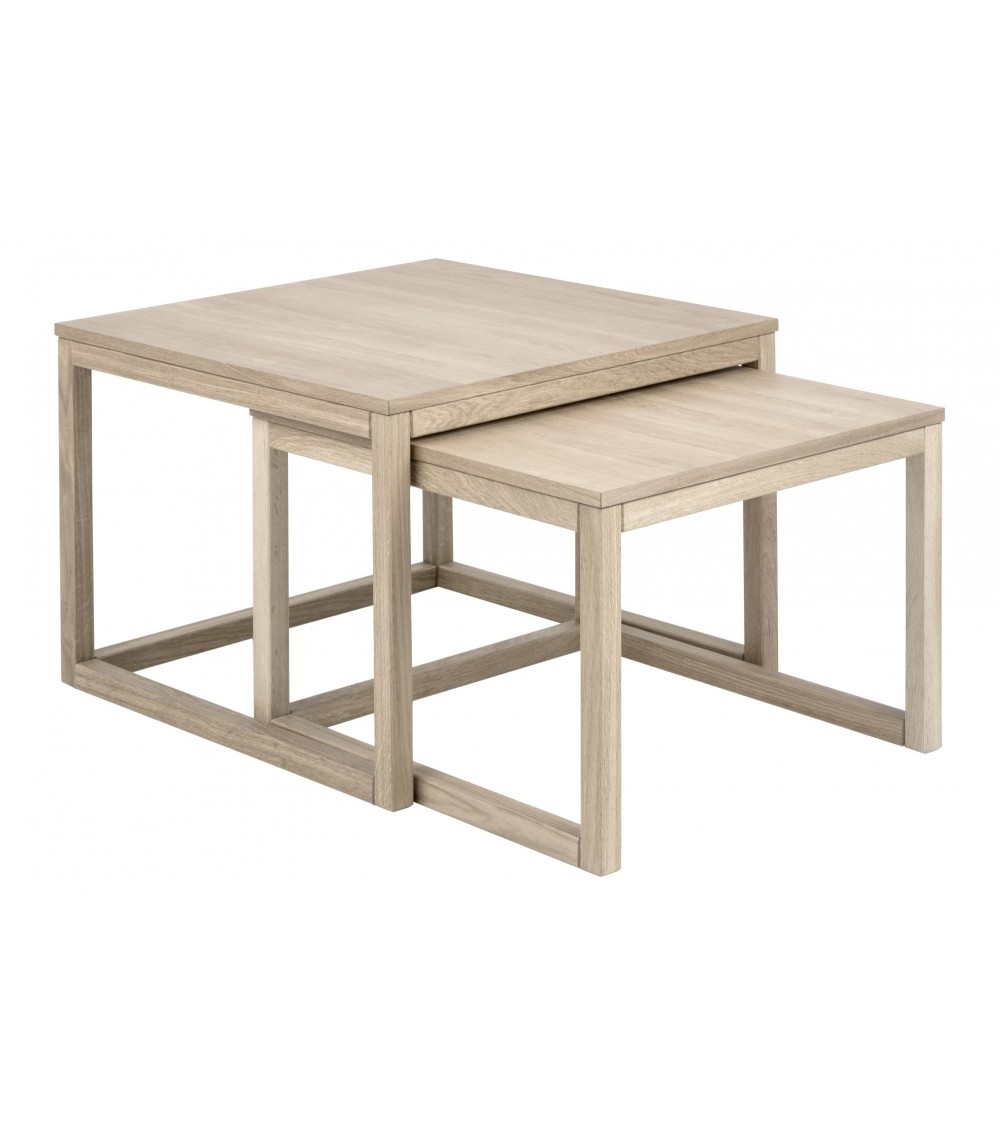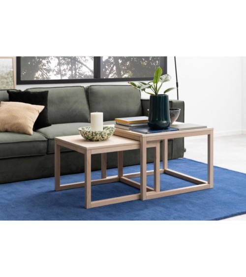 Ces deux tables basses carrés gigognes en chêne se superposent pour prendre un minimum de place et s'adapter à vos moments passés dans le salon. La table basse est déclinée en finition chêne blanchi pour s'accorder avec les autres meubles de votre salon. Description technique - Dimensions - L- 70 x H- 50 x P- 70 cm et L- 64 x H- 44 x P- 61 cmPoids net - 26 kg.Dimensions Les tables basses sont fabriquées en chêne massif et placage chêne Finition blanchi, huiléeLivré démonté / 1 colis (L 81 x H26 x P 82 cm)....