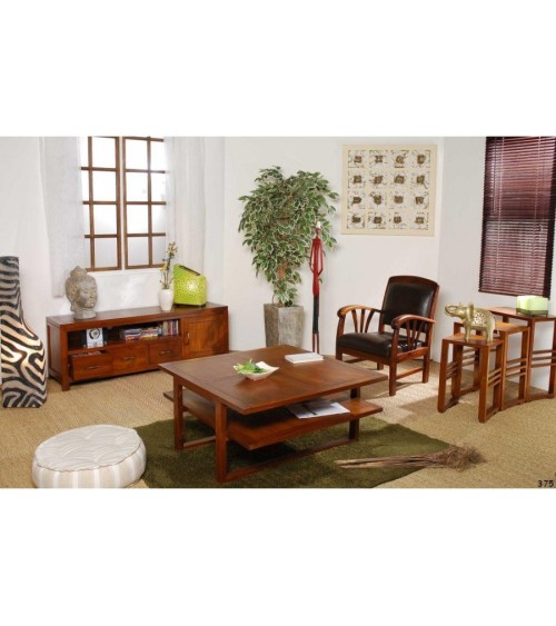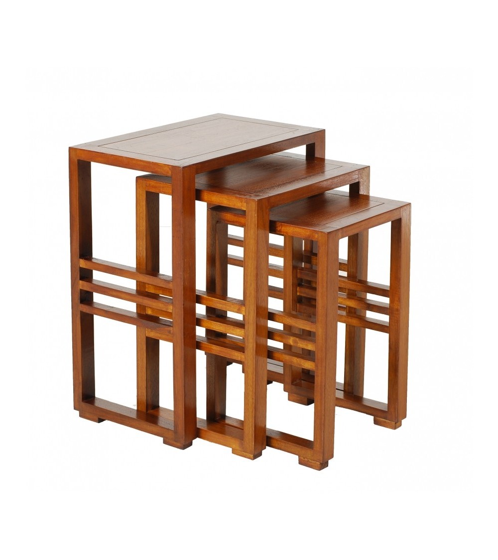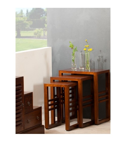 Set de 3 tables gigognes rectangulaires marrons bois Mindi. Dimensions : Grand modèle : L50,5 x H60 x P30 cm - Moyen modèle : L40,5 x H55 x P30 cm - Petit modèle L30,5 x H50 x P30 cm. Article en Mindi et Contreplaqué. Une touche ethnique, une ligne contemporaine pour rendre l'atmosphère chaleureuse. Les tables gigognes sont idéales pour tous ceux qui aiment les beaux meubles en bois. Réalisé en Mindi, bois exotique elles apporteront une touche ethnique à votre intérieur. Ces petites tables basses vous permettront de poser une lampe, une plante, un livre, le téléphone Très pratique, vous pouvez donc les disposer dans plusieurs endroits de la maison en les dissociant ou les laisser ensemble pour un effet encore plus harmonieux.