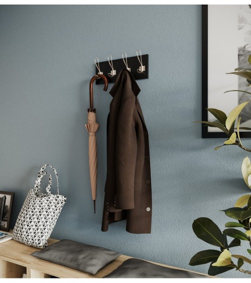 Porte-manteau mural en bois Patère 5 crochets métalQuoi de mieux quune patère pour accrocher son manteau ! La patère Nevada est en bois de paulownia, arbre originaire de Corée et du Japon, dont le bois très léger est néanmoins solide et résistant au feu. La partie inférieure de ce porte-manteau mural, un cadre rectangulaire non fermé sur le dessus, est dotée de 5 petits crochets en métal daspect argent vieilli. Lensemble est surmonté dune étagère avec rebord.Bois foncéCrochets argent vieilliLongueur : 73 cmLargeur : 12 cmHauteur : 18 cmPatère Nevada : un porte-manteau et plus encoreLa patère Nevada trouve sa place dans votre entrée, pour y suspendre manteau, veste, écharpe, parapluie ou encore sac à main. Dans votre chambre, elle accueille vos vêtements et robe de chambre lorsque vous dormez et votre pyjama ou chemise de nuit en journée. Dans votre salle de bain, vous pouvez accrocher sur la patère murale Nevada votre peignoir et vos serviettes de toilettes. Enfin, dans la cuisine, torchons, essuie-mains et tabliers y sont parfaitement rangés. Vous pourriez même linstaller dans un garage ou un appentis pour vos vêtements de bricolage ou de jardinage.Létagère présente au-dessus de la patère en bois Nevada a deux fonctions. Dune part, elle protège vos affaires de la poussière. Dautres part, elle permet dy poser toute sorte dobjets, selon la pièce où vous la fixez : trousseau de clés, portefeuille, pochette, chapeau, produits de beauté, condiments, bonbons, outils, plantes, etc.Porte-manteau mural en bois et métal : le style saloonEn bois foncé et métal daspect argent vieilli, votre patère Nevada a des airs de Far West. Elle saccorde donc parfaitement dans une déco de style saloon ainsi que rustique ou champêtre. Associez-la à la console Lazare en métal et bambou, sur laquelle vous pouvez poser vos sacs à main et pochettes.