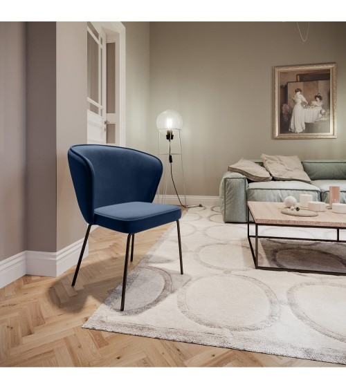 Chaise de salle à manger revêtement polyester et pieds métalPour votre confort à table ou en réunion, vous recherchez une chaise qui soit aussi accueillante quun fauteuil ? Optez pour la chaise Gaya, revêtue dun velours 100% polyester, très doux au toucher. Elle possède une large assise rembourrée de mousse ainsi quun dossier plein et enveloppant comme si vous étiez dans un cocon. Son piètement moderne, légèrement évasé, est en métal. Longueur : 59 cmLargeur : 62 cmHauteur : 82 cmHauteur dassise : 46 cmQuel bonheur de savourer un bon repas entouré de sa famille ou de ses amis ! Le plaisir est encore plus grand lorsquon est confortablement installé. Cest toute la promesse que vous fait la chaise de salle à manger Gaya. Son revêtement en velours 100% polyester est incroyablement doux, et très facile à nettoyer, avec un simple tissu humide, ce qui est bien appréciable quand on est à table.Lassise de la chaise Gaya est large et rembourrée de mousse. Le dossier est parfaitement enveloppant, plein et arrondi, comme si vous étiez dans un fauteuil. Vous souhaitez retrouver ce confort au bureau et loffrir à vos collaborateurs et clients ? Aménagez votre salle de réunion avec nos chaises en velours Gaya. Chaise Gaya Bleu Nuit : esprit Mille et une nuitsLe bleu nuit est un bleu profond et envoûtant, qui apporte une touche de mystère à votre intérieur. Créez ainsi une ambiance digne des contes des Mille et une nuits dans votre salle à manger avec vos chaises Gaya bleu nuit. Complétez votre déco avec des objets dorés, comme le luminaire suspension en métal or, pour éclairer votre table, ou cette belle corbeille Éléonore.Pour augmenter votre confort et rester dans lesprit cocooning, agrémentez vos chaises Gaya de beaux coussins. Potiron vous conseille le coussin Viktoria bleu foncé ou jaune moutarde. Vous préférez le style vintage ou graphique ? Faites un tour du côté des coussins Sagan, Grues japonaises ou Cubo.