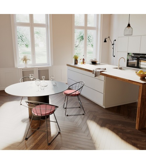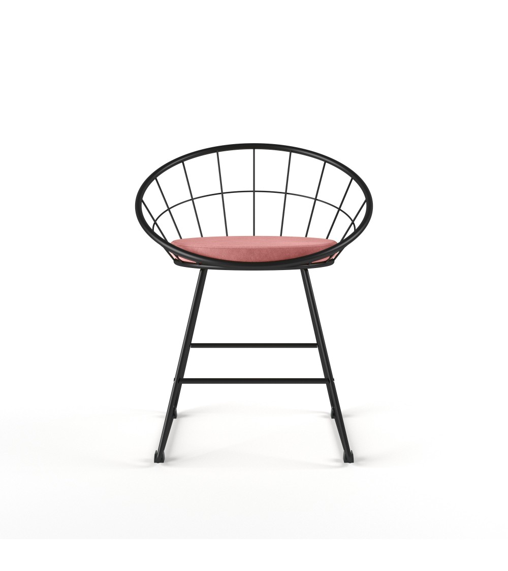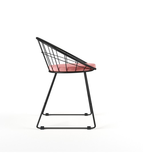 Chaise Joane, structure en métal noir, coussin de velours rose vintageVous pourrez en demander beaucoup à la chaise Joane en métal et velours rose vintage : elle est belle, accepte tous les styles de déco, insuffle une note aérienne à la pièce que vous lui assignerez, que ce soit votre salle à manger, votre salon, une chambre ou un bureau. Un meuble de charme chic et choc !Structure en métal et bois dingénieriePieds en métalCoussin en velours rose vintage 100% polyester - Densité de lassise 20 kg/m3DimensionsHauteur totale : 72 cmHauteur dassise : 48 cmLongueur : 57,5 cmLargeur dassise : 51 cmChaise Joane métal et velours, les moments de pause tendanceLe coin repas est celui de la rencontre?; on sy assied, on y déjeune en famille, on y échange, on y reçoit, en un mot, il occupe une place importante. Cette chaise de table Joane rose vintage en forme de coquille vous convie à des moments délicieux, autour de la table de la salle à manger, dans le salon pour un thé, dans la bibliothèque pour se plonger dans un roman. Ergonomique, elle est stable et dassise accueillante. Elle donne le La dun intérieur confortable et design, inventif et unique, capable de faire une forte impression sur vos invités.Chaise de table Joane, entre cocooning et style loftLa chaise de table Joane en métal et velours rose vintage se fond avec le même talent dans un décor très doux, façon cocooning, que dans un style loft moderne et épuré. Et pour cause?! Dun côté, la forme souple et ronde enveloppe comme seul un cocon peut le faire, avec latout du coussin rose vintage en velours rassurant. De lautre, sa fine structure métallique, faite de courbes géométriques, semble flotter sur un piètement rectiligne minimaliste. Refuge raffiné ou loft moderne?? Cette chaise de table design et confortable suit votre envie.