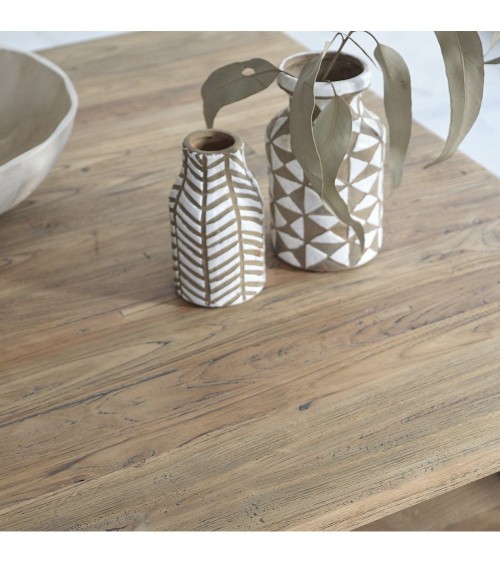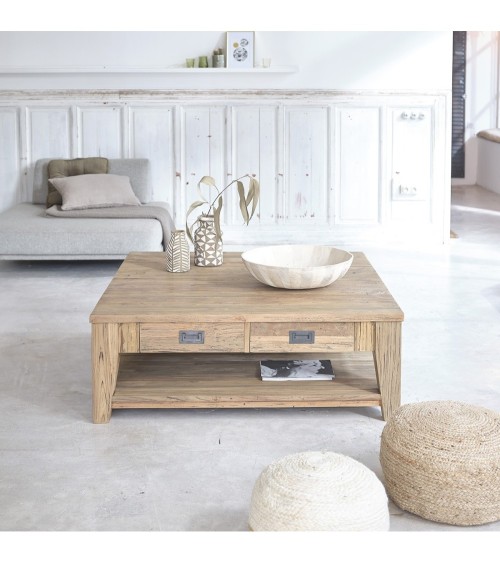 Cette table basse en bois de teck recyclé propose un format carré pour confirmer le design authentique. Installée dans votre salon, ses tiroirs et son double plateau vous permettront de ranger toutes vos petites affaires du quotidien. Caractéristiques : Matière : Teck recyclé - Couleur : Bois naturel - Hauteur : 42 cm - Longueur : 120 cm - Largeur : 120 cm - Poids : 68 kg - Garantie : 2 ans - Montage : Livrée montée. Les + : Teck recyclé 2 tiroirs - Double plateau Format carré.
