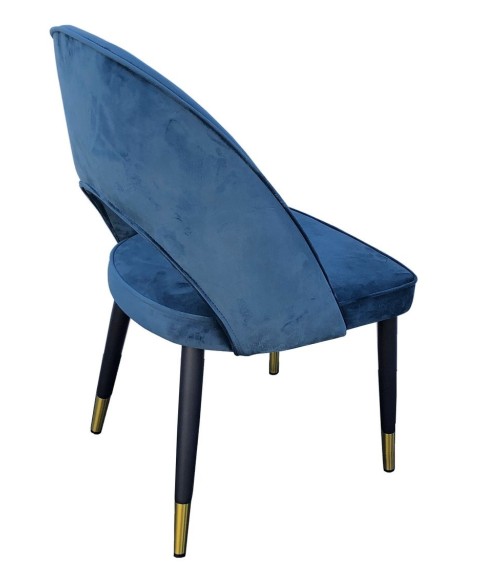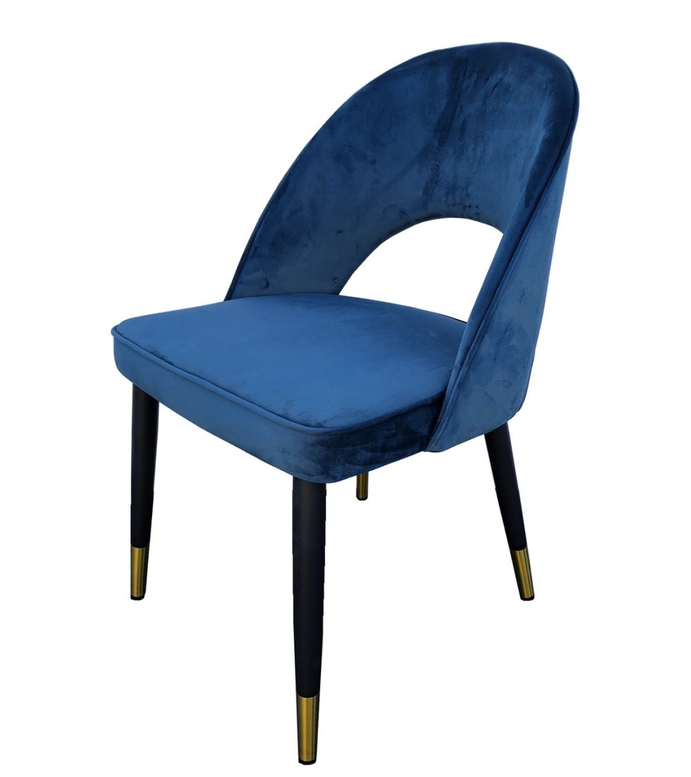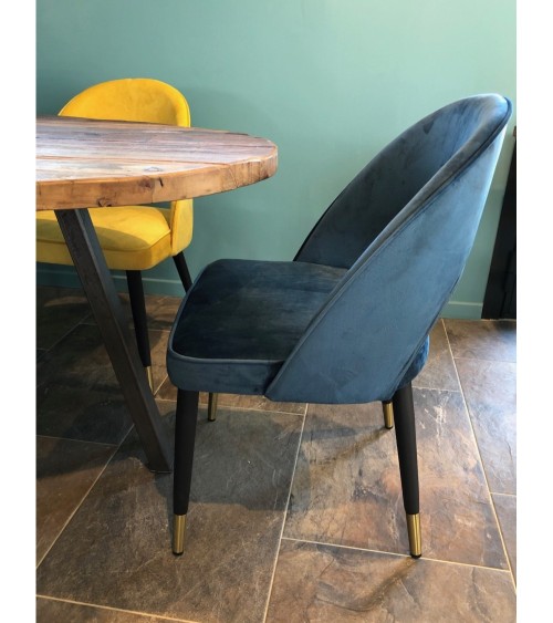 Chaise de repas dans la tendance Art Déco en velours bleu. Doux et résistant, chaud et isolant, le velours a bien des qualités en plus d'évoquer le luxe. Plébiscité sur les assises et les coussins, il est le champion du confort et traverse les époques et les modes. Décorez votre salle à manger avec cette assise confortable, robuste et tendance. Ses pieds sont en acier noir mat avec une finition laiton aux extrémités.