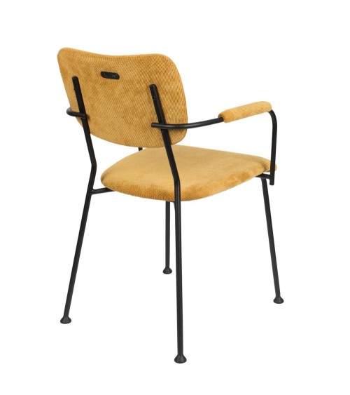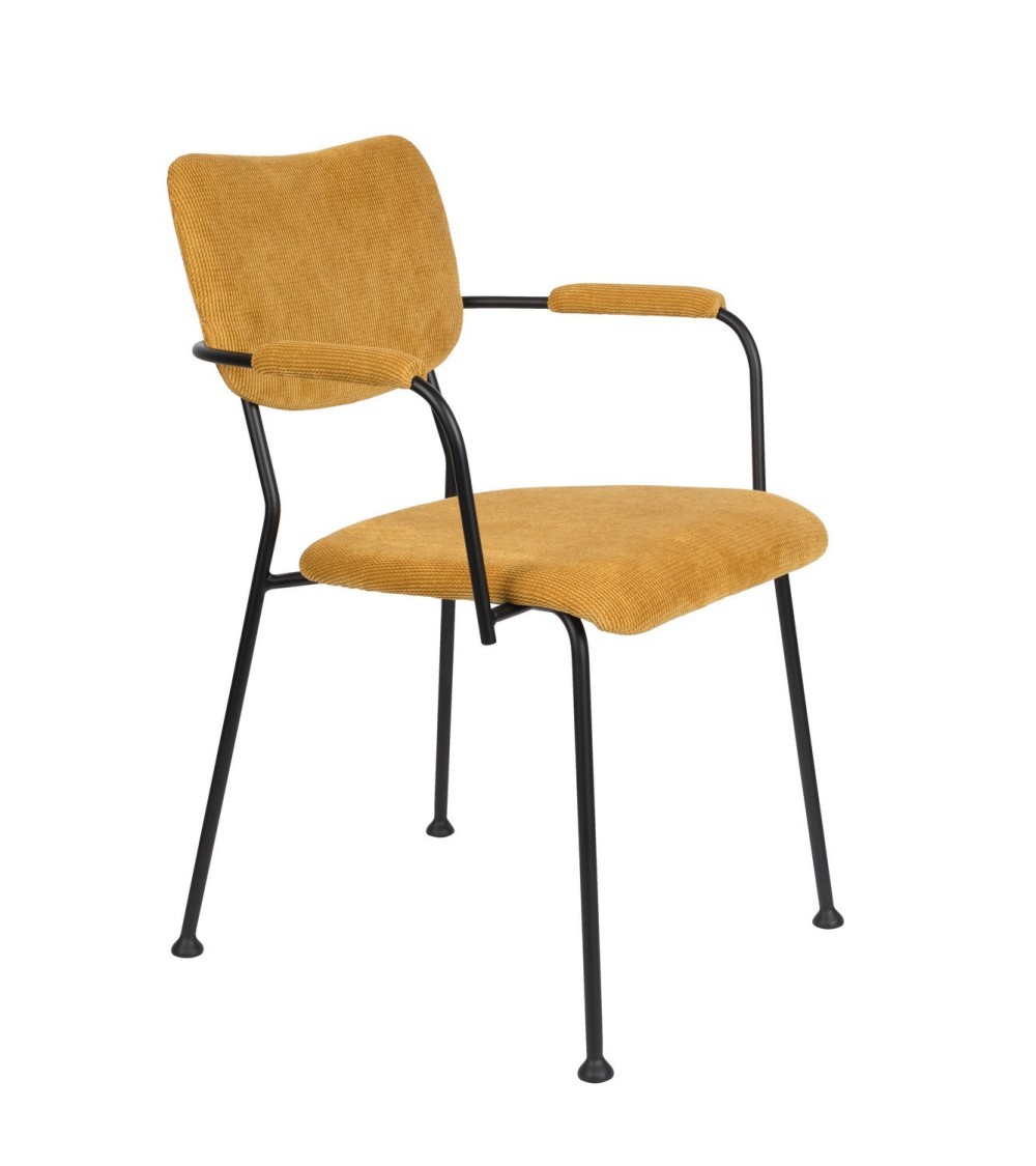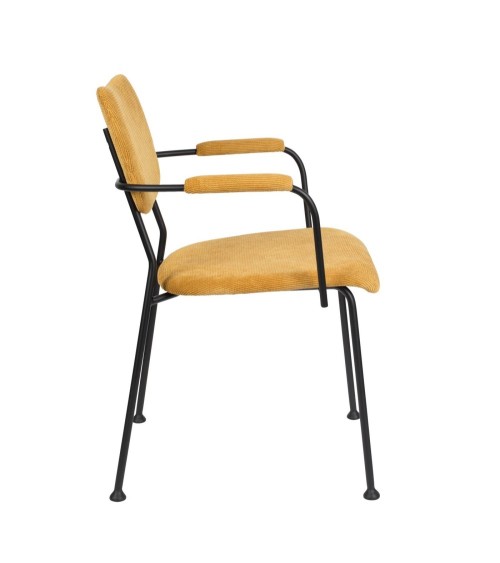 Chaise de repas avec accoudoirs de belle qualité avec une assise confortable en tissu velours quadrillé jaune Ocre. Les solides pieds en acier noir lui confèrent une légèreté visuelle très actuelle. La collection Benson de Zuiver comprends les chaises avec ou sans accoudoirs et les tabourets de bar assortis en 2 hauteurs d'assises et déclinées dans plusieurs couleurs tendance.