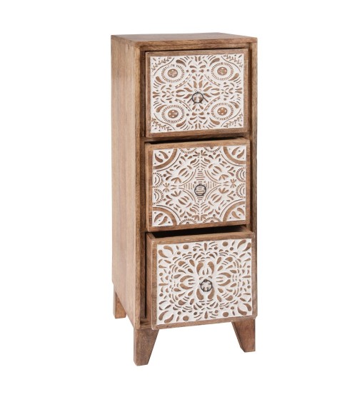 Meuble de rangement 3 tiroirs en manguier à motifs gravés blancs