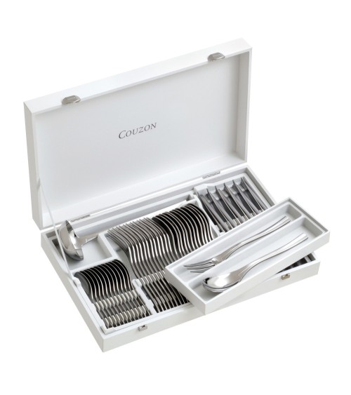 Ecrin en bois blanc pour le rangement d'une ménagère de 48 à 51 pièces.Couzon imagine des solutions de rangement élégantes pour vos couverts. Un contenant élégant pour un contenud'exceptionCouzon est une référence française des arts de la table depuis 1947. Dans un style unique et original, Couzon imprime sa marque dans un design contemporain. Ces couverts se vivent au quotidien comme dans les moments d'exception. Nos gammes sont proposées en acier inox 18/10 de haute qualité et en métal argenté.