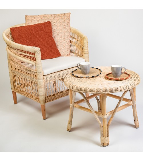 Découvrez cette magnifique table basse en rotin tissée à la main par des artisans vaniers. Cette table ronde en rotin est dotée de 4 pieds en rotin qui lui apporte une grande stabilité. Elle peut être utilisée comme table basse dans votre intérieur ou bien dans une véranda. Son look est tendance est 100% naturelle avec une touche de vintage revisité. Le plateau fait 60 cm de diamètre avec une hauteur de 56 cm. Si vous utilisez la table basse ronde en rotin en extérieur il faudra la protéger l'hiver.