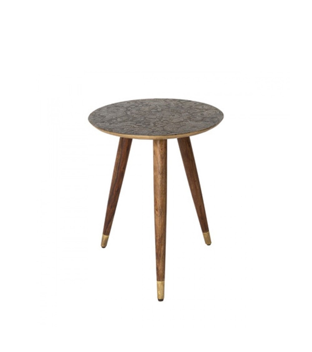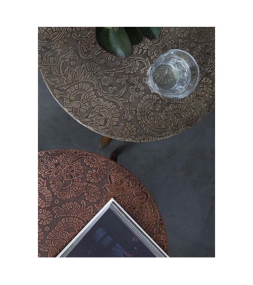 Cuivre, métal, laiton : la table d'appoint vintage tripode Bast s'adapte à tous les goûts et tous les styles !  Authentique, son plateau en bois de palissandre a été embossé à la main avec des motifs inspirés d'anciens tampons de bois indiens utilisés pour l'impression des tissus.  Cette table d'appoint trouve sa place dans le salon, le bureau ou la chambre. Elle trouvera facilement sa place dans une décoration vintage ou éthnique. On peut aussi l'intégrer à un intérieur contemporain pour un effet décalé très original ! Caractéristiques : Couleurs : cuivre, métal, laitonComposition : Bois, métalÀ assembler suivant instructions jointes