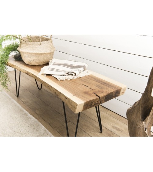 Banc nature Mungur pieds épingles scandi métal. Dimensions : 160 x 45 x 44 cm. Article en Mungur et Acier. Cet article est composé de bois de Mungur ! Ce bois exotique est utilisé à l'état brut pour fabriquer ce produit authentique. Il est donc normal qu'il présente des variations de teintes ainsi que des petites irrégularités puisqu'il s'agit de sa particularité. Installez-vous sur ce joli banc naturel en bois de Mungur et métal. Doté de pieds épingles noirs, il est tendance. Son assise est authentique et unique. Le rendu est minimaliste pour que vous puissiez l'associer à votre décoration actuelle.