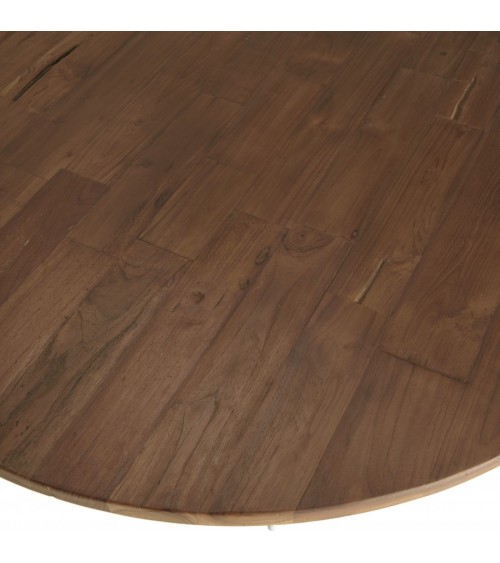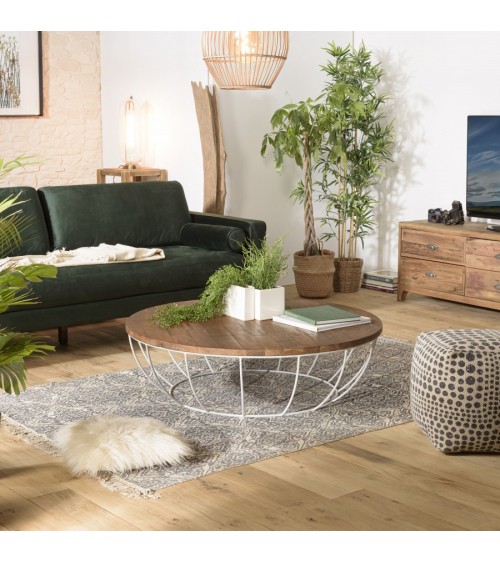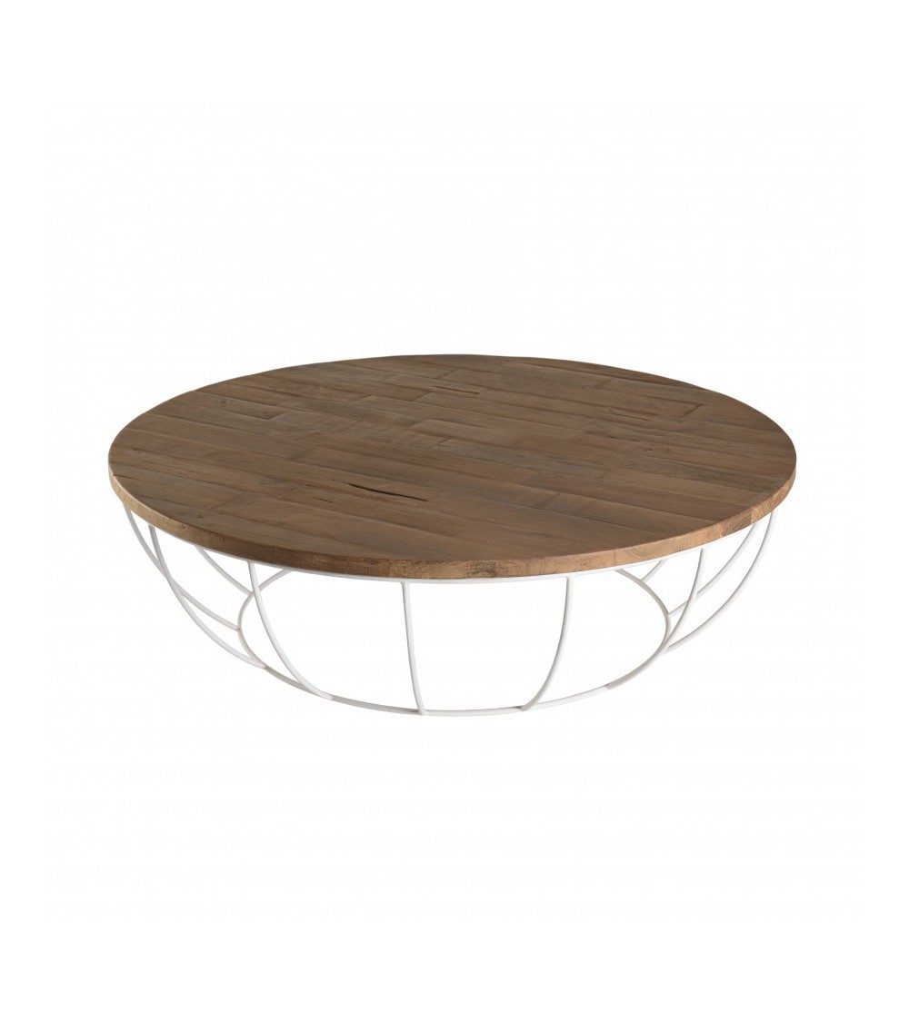 Table basse coque ronde 120x120cm plateau Teck recyclé piétement métal blanc. Dimensions : 120 x 120 x 35 cm. Article Teck recyclé / Métal. Cet article est composé de bois recyclé ! Le bois recyclé est un bois récupéré de vieilles charpentes, de coques de bateaux ou tout bois de récupération ayant déjà eu une longue vie. C'est ce qui lui donne cet aspect vieilli et authentique avec ses imperfections qui font tout son charme. Acquérir du bois recyclé est une initiative écoresponsable qui permet de lutter contre la déforestation. Cette jolie table basse ronde en teck recyclé apportera chaleur et charme à votre intérieur. Bois et métal de couleur blanche sont au rendez-vous pour un résultat unique. En famille ou entre amis, vous pourrez profiter de cette table pour recevoir des invités.