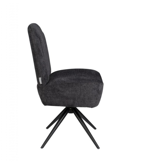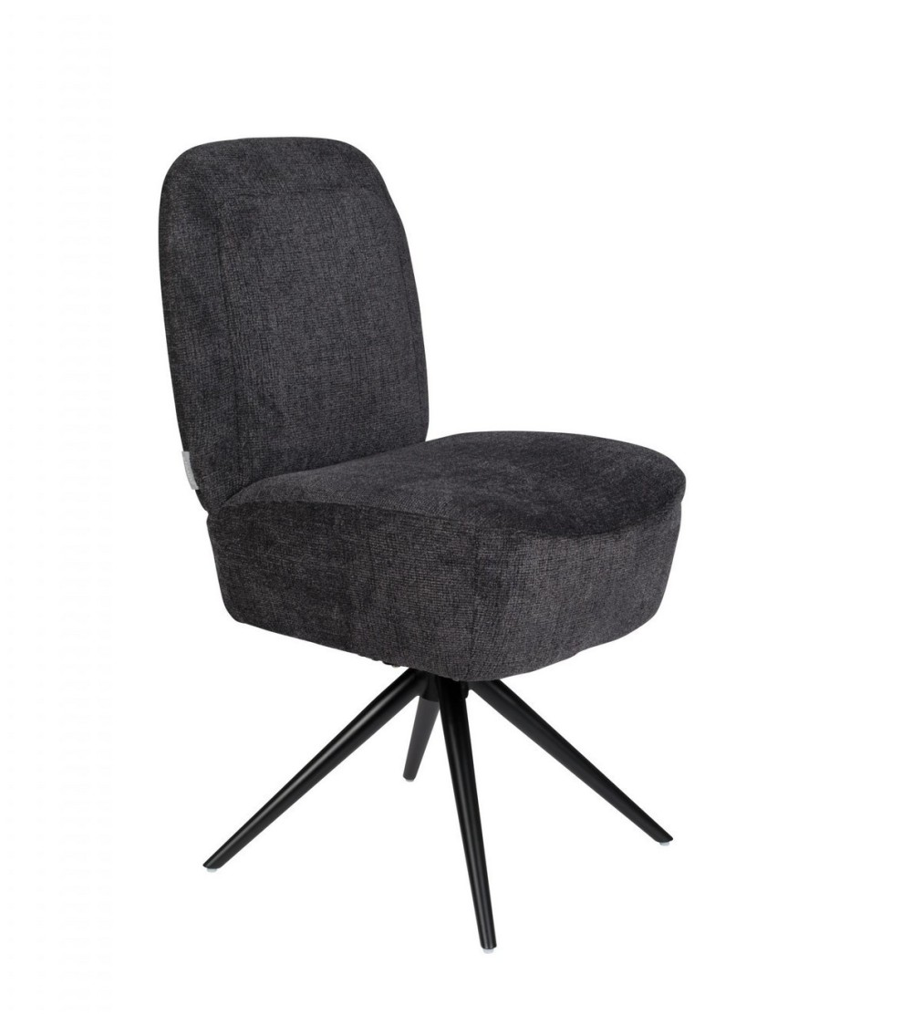 Chaise design et confortable Dusk de la marque Zuiver en tissu gris foncé. Idéal autour d'une table de repas. Revêtement 100% polyesterCadre en bois d'eucalyptus UK FR Mousse, densité 28Base rotativeCharge maximale: 200 kgDimensions: 55x50x85 cm (LxPxH)Hauteur d'assise: 46 cmProfondeur d'assise: 45 cmRemarque: ce produit est fabriqué selon les normes du règlement britannique de 1988 sur les meubles et l'ameublement (incendie, sécurité). La chaise est également décliné en fauteuil avec ou sans repose-pieds.