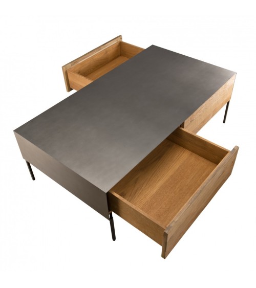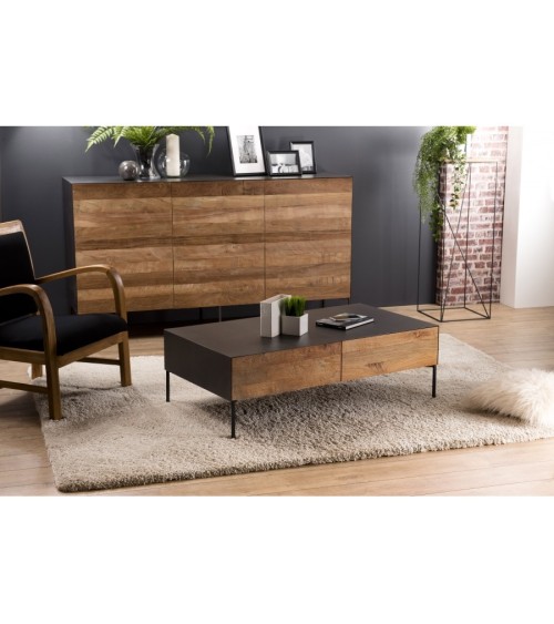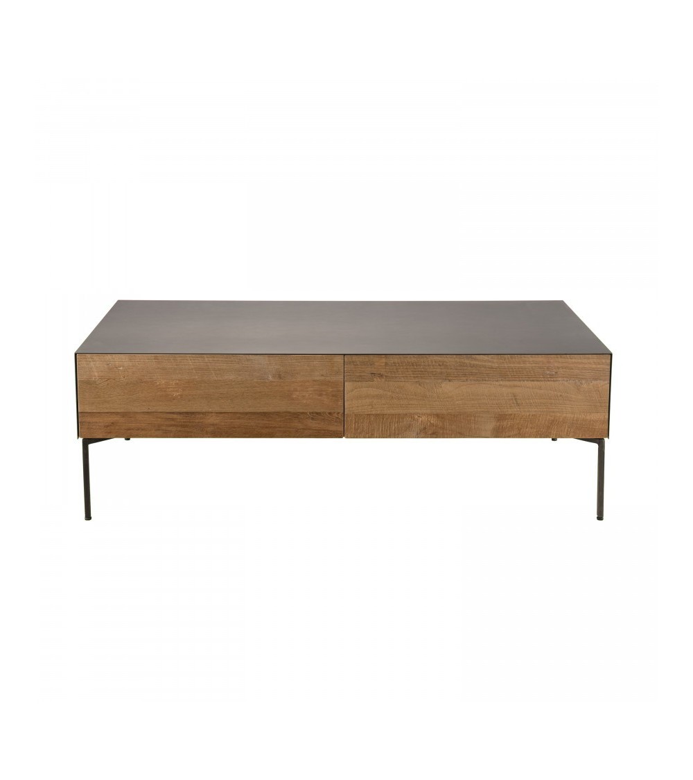 Table basse 2 tiroirs teck recyclé pieds métal gris anthracite L111