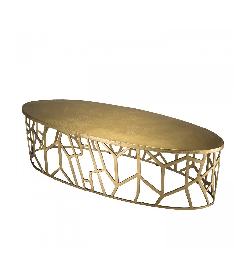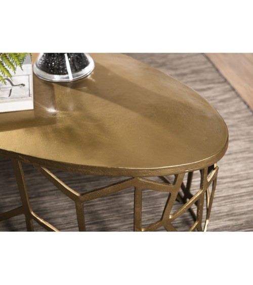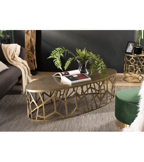 Table basse ovale 150x60cm aluminium doré piètement graphique. Dimensions : 150 x 60 x 40 cm. Article en Aluminium. Collection indéfinissable tellement elle resplendit par la noblesse de sa matière. En un clin d'il, cette gamme aux allures orientales illuminera votre intérieur avec sa couleur dorée et argentée.
