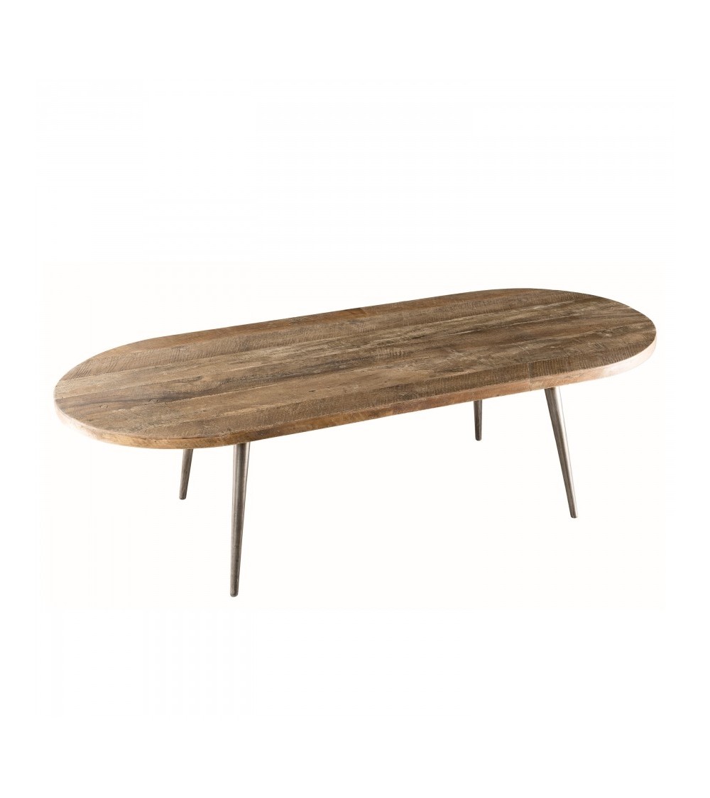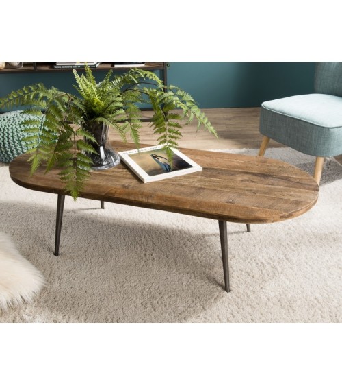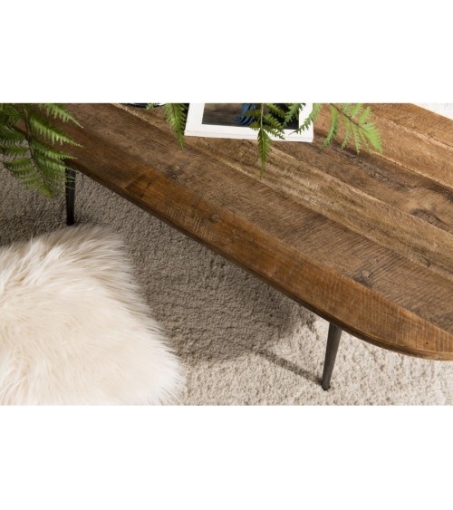 Table basse marron ovale teck recyclé pieds métal. Dimensions : 120 x 50 x 35 cm. Article en Teck recyclé et Métal. Cet article est composé de bois recyclé ! Le bois recyclé est un bois récupéré de vieilles charpentes, de coques de bateaux ou tout bois de récupération ayant déjà eu une longue vie. C'est ce qui lui donne cet aspect vieilli et authentique avec ses imperfections qui font tout son charme. Acquérir du bois recyclé est une initiative écoresponsable qui permet de lutter contre la déforestation.