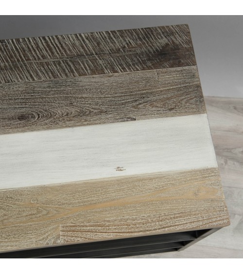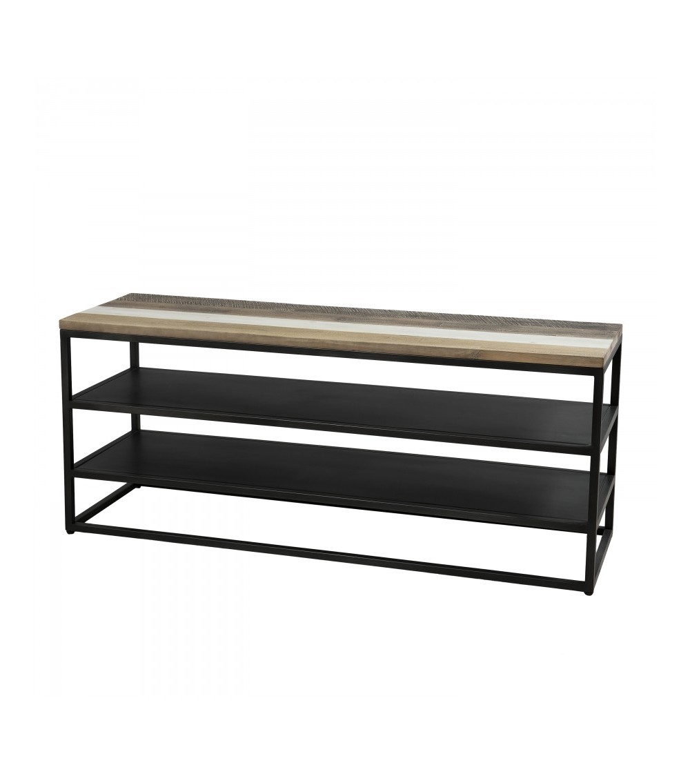 Meuble TV noire bois acacia et métal 2 étagères. Dimensions : 130 x 40 x 56 cm. Article en Acacia / Acier. Cet article est composé de bois d'acacia de plusieurs coloris !  Cette collection présente donc diverses teintes plus ou moins claires. Il est possible de trouver des petites imperfections ou des irrégularités puisqu'il s'agit de pièces uniques assemblées pour ne créer qu'un seul produit.   Acquérir du bois recyclé est une initiative écoresponsable qui permet de lutter contre la déforestation.