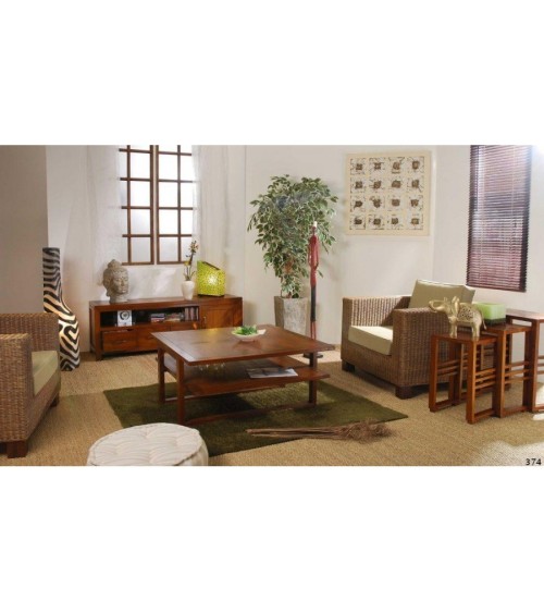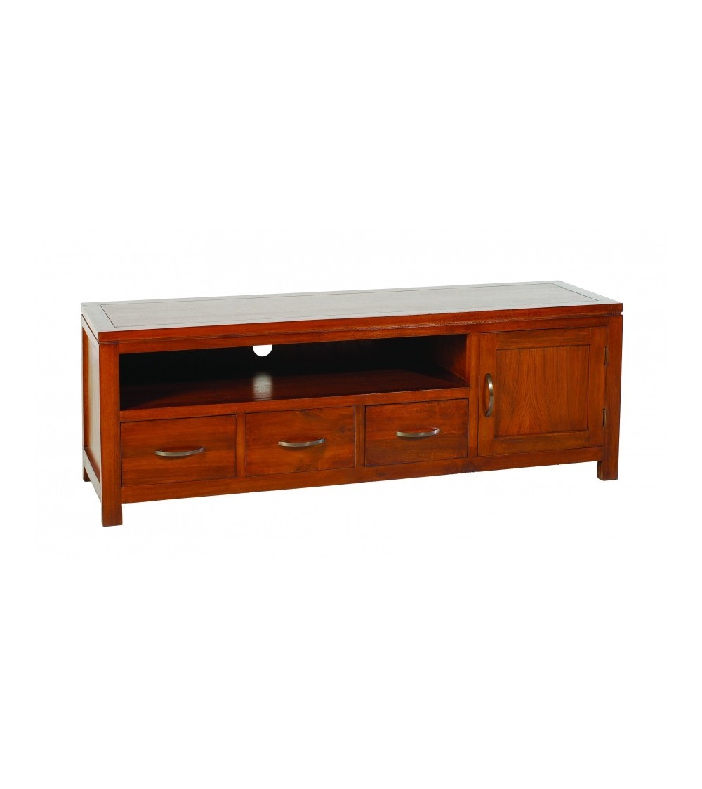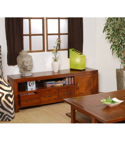 Meuble TV bas 3 tiroirs marron bois Mindi. Dimensions : 140 x 40 x 50 cm. Article en Mindi et Contreplaqué. Une touche ethnique, une ligne contemporaine pour rendre l'atmosphère chaleureuse. Le meuble TV pour tous ceux qui aiment les beaux meubles en bois ! Réalisé en Mindi, bois exotique et en contreplaqué il apportera une touche ethnique à votre intérieur. Il se mariera à merveille avec tous les types de déco grâce à sa ligne épurée, une teinte chaleureuse et une belle finition par un vernis à base de gomme laque pour un toucher velouté. Très bien agencé, il présente de multiples rangements. Une grande niche pour vos lecteurs DVD, décodeurs et adaptateurs TNT 3 tiroirs et une porte.