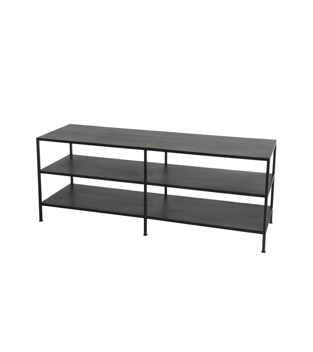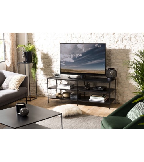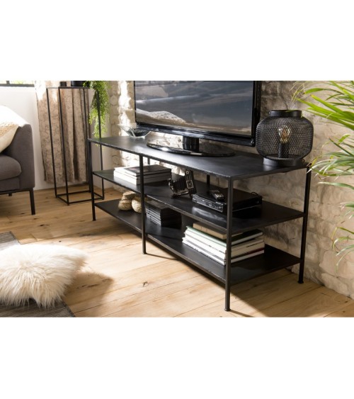 Meuble TV noir 2 étagères métal industriel. Dimensions : 140 x 45 x 55,5 cm. Article en Métal. 100% pure tendance industrielle pour cette gamme. L'alliage du métal et du bois brut donne du caractère à cette superbe collection artisanale. On ne peut rester indifférent devant ce mobilier très typé. Ce meuble TV en métal noir mettra votre télé en valeur par sa simplicité et son petit côté industriel. Composé de plusieurs niveaux, vous pourrez y déposer de multiples objets décoratifs de votre choix : petite plante, bougies, livres