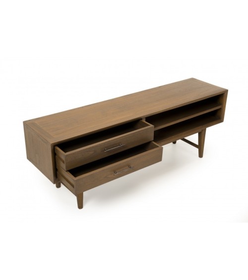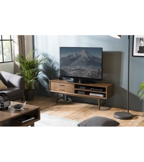 Meuble TV marron 2 tiroirs 2 niches bois Mindi. Dimensions : 140 x 35 x 50 cm. Article en Mindi et Contreplaqué de Mindi. Vous retrouverez l'ambiance à la fois chaleureuse et nordique avec notre gamme Lara. Epurée, lumineuse, Lara vous apporte une touche de douceur avec sa teinte noyer.