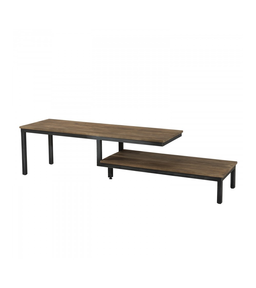 Meuble TV 2 tablettes plateau en teck recyclé et pieds métal noir