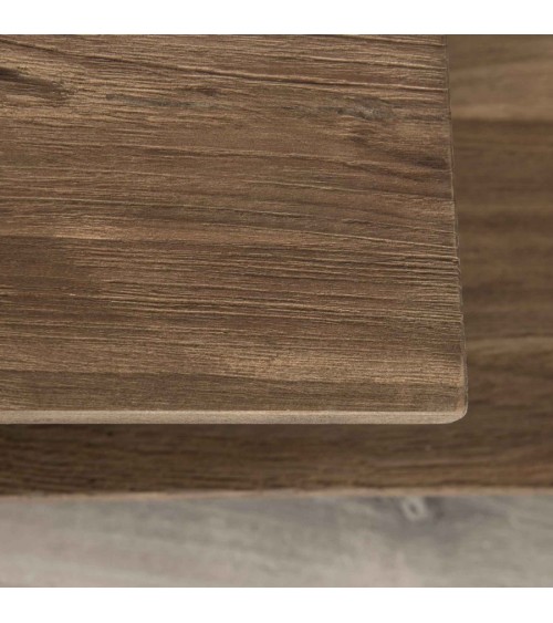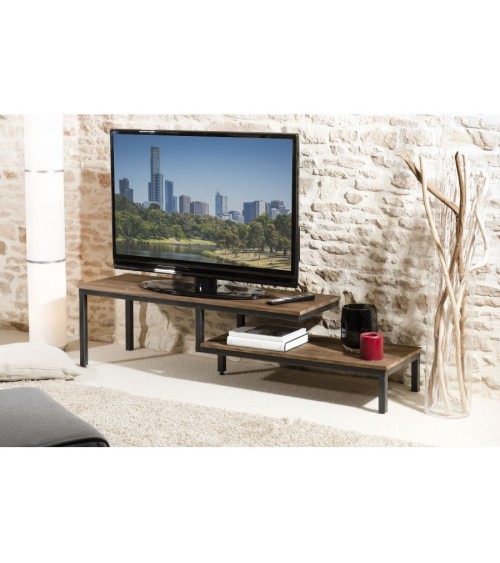 Meuble TV 2 tablettes plateau teck recyclé pieds métal noir. Dimensions : 161 x 40 x 40 cm. Article en Teck recyclé et Métal. Cet article est composé de bois recyclé ! Le bois recyclé est un bois récupéré de vieilles charpentes, de coques de bateaux ou tout bois de récupération ayant déjà eu une longue vie. C'est ce qui lui donne cet aspect vieilli et authentique avec ses imperfections qui font tout son charme. Acquérir du bois recyclé est une initiative écoresponsable qui permet de lutter contre la déforestation.