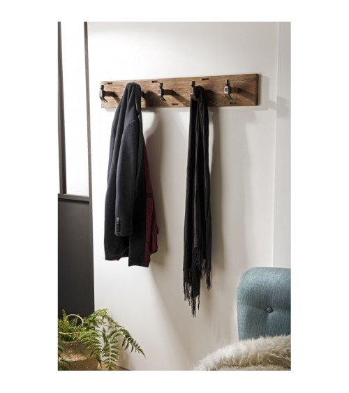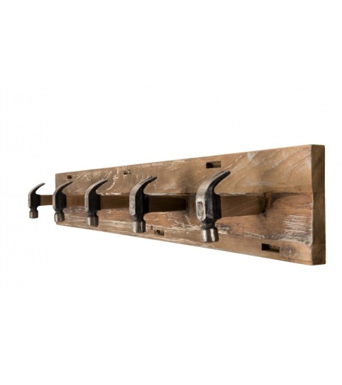 Portemanteau mural marron 5 crochets marteaux teck recyclé et métal. Dimensions : 100 x 13 x 15 cm. Article en Teck recyclé et Métal. Cet article est composé de bois recyclé ! Le bois recyclé est un bois récupéré de vieilles charpentes, de coques de bateaux ou tout bois de récupération ayant déjà eu une longue vie. C'est ce qui lui donne cet aspect vieilli et authentique avec ses imperfections qui font tout son charme.   Acquérir du bois recyclé est une initiative écoresponsable qui permet de lutter contre la déforestation.
