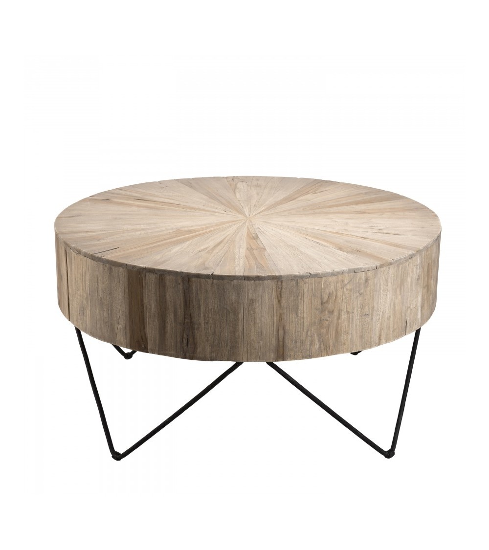 Table basse ronde nature plateau en teck pieds épingles métal noir D90
