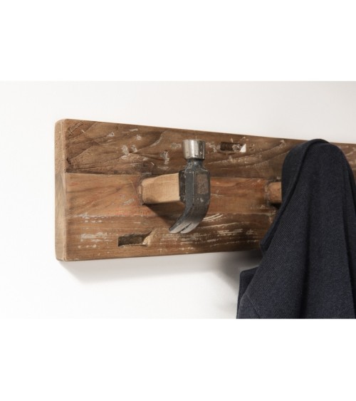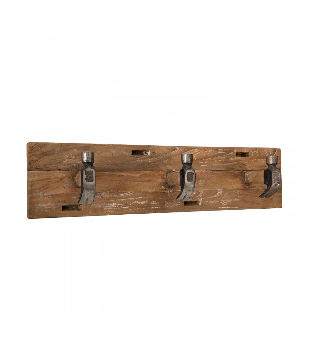 Portemanteau mural marron 3 crochets marteaux teck recyclé et métal. Dimensions : 60 x 13 x 15 cm. Article en Teck recyclé et Métal. Cet article est composé de bois recyclé ! Le bois recyclé est un bois récupéré de vieilles charpentes, de coques de bateaux ou tout bois de récupération ayant déjà eu une longue vie. C'est ce qui lui donne cet aspect vieilli et authentique avec ses imperfections qui font tout son charme. Acquérir du bois recyclé est une initiative écoresponsable qui permet de lutter contre la déforestation.