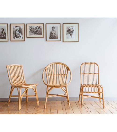 Notre chaise en rotin naturel Magalie vous suivra sans broncher du salon à une terrasse couverte, en passant par la véranda. Son confort est étonnant même sans coussin. Sa construction à grand renfort de cannes de rotin au diamètre surdimensionné et le suppression de presque toutes les ligatures (le point faible de tout mobilier en rotin) ont été prévues pour un usage intensif. Ecolodges, gites ruraux, cabanes dans les arbres, ... voici le siège qui conjugue naturel, confort des clients, et sérénité des exploitants. Le léger surcoût de cette structure renforcée sera rapidement amorti par rapport à une  standard.Structure et ligatures en rotin naturel non écorcé, 4 patins en nylon sous chaque, hauteur 85 cm x largeur 60 cm x profondeur 60 cm, assise à 45 cm du sol, poids 3.5 kg seulement (sans coussin). Fabrication Indonésie. Coussin non inclus.