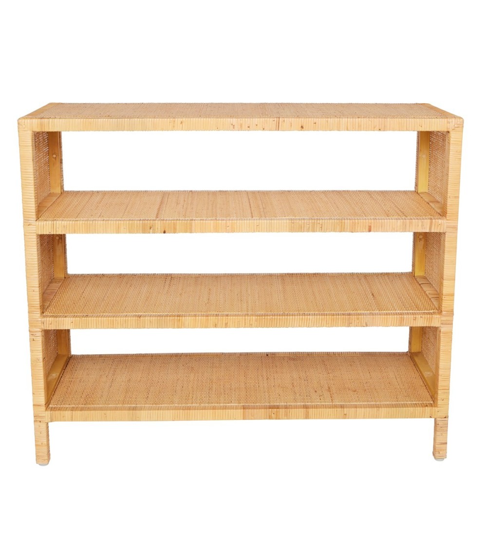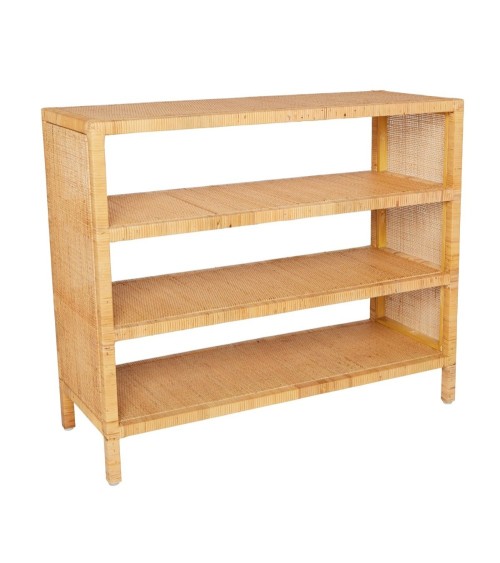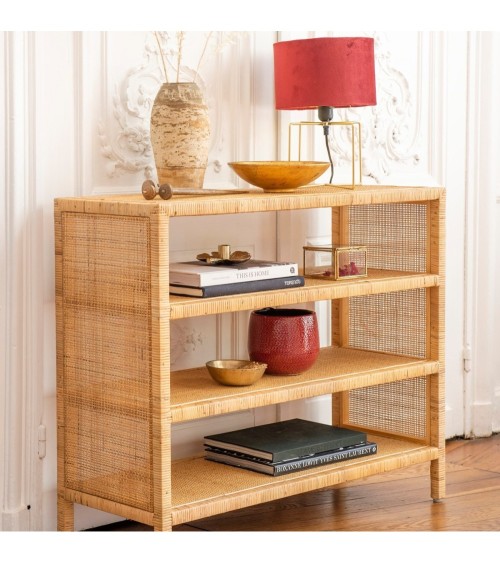 Nous avons créé cette étagère sur structure en bois assif avec le même motif de tissage raffiné et léger que celui des . Le cannage est ajouré sur les côtés pour laisser passer la lumière à l'intérieur à la façon d'un moucharrabieh. Il est fermé et tissé sur une planche de bois sur le dessus et sur les étagères intermédiaires pour vous permettre d'y poser des petits objets. Dans une salle de bain, une entrée, une cuisine, une chambre, et en plus de son côté pratique, elle apportera par sa blondeur et son aspect naturel, la chaleur qui manque parfois à nos intérieurs contemporains.Tressage en éclisse de rotin naturel. Structure en pin massif. Les étagères sont fixes.Dimensions : hauteur 76 cm x largeur 90 cm x profondeur 35 cm. Poids 8.5 kg. Livrée montée. Fabrication Indonésie