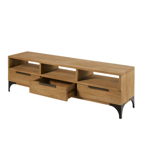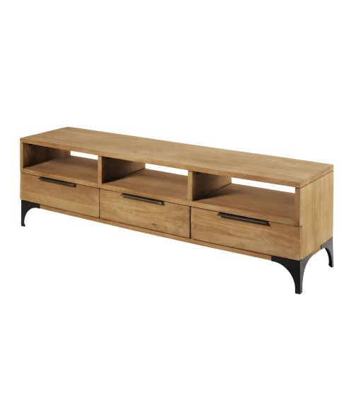 Même votre salon cosy à le droit à sa dose de matériaux bruts ! Inspiré du design industriel, le meuble TV 3 portes en manguier massif et acacia METROPOLIS sera idéal pour votre salon urbain. Fonctionnel, ce meuble TV présente 3 tiroirs, de quoi ranger vos appareils électroniques et petits objets du quotidien. Les pieds et poignées en métal grisé offrent un joli contraste avec la structure et le plateau en manguier massif. À adopter de suite !