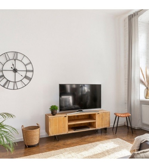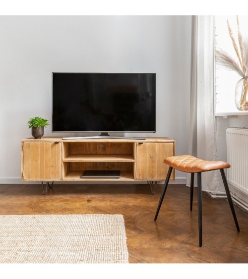 Optez pour Jules, le meuble tv à la fois contemporain et authentique qui enchante par son design et sa fonctionnalité. Il est équipé de 2 niveaux ouverts avec pour chacun des trous situés à l'arrière pour permettre le passage de vos cables. Jules exposera joliment votre téléviseur et tout autre objet décoratif. Grace aux pieds et poignées en métal, le meuble TV gagne une touche loft industriel. Les pieds sont fabriqués à partir d'acier brut qui peuvent avoir quelques aspérités telles que des marques qui prouvent son authenticité. En choisissant cette finition brute, vous êtes à la recherche d'un aspect industriel. Informations techniques:Dimensions : L 150 x P 39 H 50 cmPoids: 33 kgMatière : pin massifDimensions casiers fermés : L 36 x 33 x H 36 cmDimensions 2 niches L 70 x 37 x H 17 cm2 trous de 3 cm de diamètre pour le passage des fils à l'arrièreLe meuble tv Jules est livré semi-monté. Il suffit d'assembler les pieds au plateau via des vis que nous vous fournissons.Elle a été fabriquée avec soin par nos artisans avec un bois massif issu de forêts certifiées pour une consommation responsable. Les finitions sont toutes réalisées à la main, sans solvants et sans produits toxiques pour la santé de tous et le respect de l'environnement. Entretien : nettoyez votre meuble en l'essuyant avec un chiffon humide.
