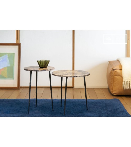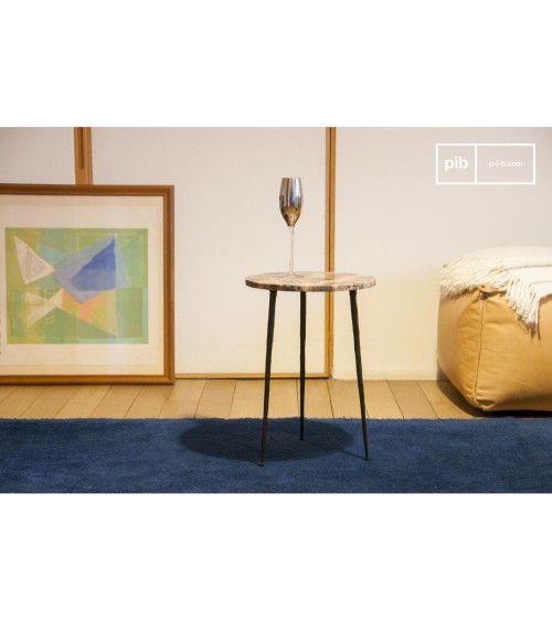 Ce produit vous est proposé par la marque pib. Une table d'appoint en marbre, charmante et discrète. Avec sa petite tablette circulaire en marbre nervuré de blanc et ses trois pieds en métal élancés, cette table d'appoint est un meuble discret, minéral et élégant, qui s'insérera dans votre espace sans l'alourdir. Son design et sa structure tripode sont typiques des années 50, mais ses pieds texturés, légèrement bosselés et ondoyants, lui apportent une touche plus moderne et originale. Discrète et délicate, cette table d'appoint possède aussi l'avantage d'être très solide. Elle pourra ainsi supporter un plateau, de gros livres ou un pot de fleurs.