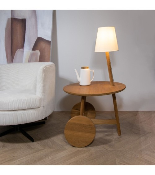 Est à la fois table dappoint en teck et lampe, Triss accompagne les moments de détente ou de lecture. Elle remplira aisément la fonction de table de nuit, guéridon ou éclairage dappoint. Information sur la composition : Le teck produit un bois précieux et imputrescible recommandé pour la fabrication des ponts de bateaux, de meubles de jardin. Teck couleur naturelle Abat jour en coton blanc Design Tomo KIMURA Longueur Câble 1.50m