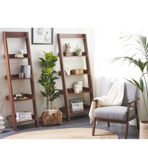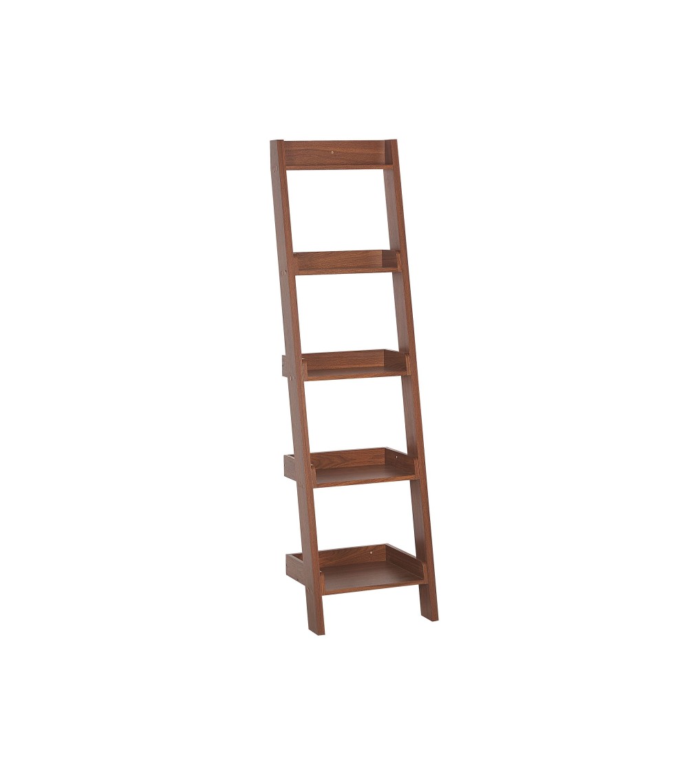 Étagère échelle 4 niveaux en MDF. Une bibliothèque qui impressionne par sa forme intéressante et qui est en même temps un meuble pratique pour garder en vue vos objets préférés ou votre collection. Les étagères sont montées sur le cadre de manière à ce que l'ensemble ressemble à une échelle. Les étagères peuvent être remplies de vos titres préférés et d'accessoires brillants et complémentaires, créant ainsi une charmante composition visuelle. Détails: Type de produit: Étagère en échelle Style: Moderne Couleur principale: Bois foncé Type de matière: Bois d'ingénierie Matière principale: MDF Matière du piétement: Bois d'ingénierie Nombre d`étagères: 5 Finition: Mat Dimensions: Profondeur: 43 cm Largeur: 45 cm Hauteur: 169 cm Poids: 12 kg Charge maximum de l`étagère:: 3 kg Charge admise du plateau: 3 kg L`offre inclue: 1 x Etagère Caractéristiques clés: Étagère pratique, parfaite pour entreposer des bibelots, S'adapte à différents types d'intérieurs, Finition effet bois pour un look naturel, De haute qualité, Facile à entretenir et extrêmement durable Informations d`assemblage: À assembler entièrement. 45 - 60 min Informations supplémentaires: Veuillez noter que pour des raisons de sécurité, le produit doit être fixé au mur. Les fixations nécessaires sont incluses dans l'offre. Conseils de maintenance: MDF: 1.Nettoyez avec un chiffon et un détergent doux. Essuyez bien après le nettoyage.