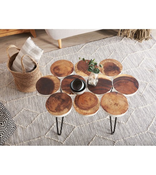 Conçue dans un mélange équilibré de tendances de design naturel et industriel, cette table basse s'adapte parfaitement à tous les intérieurs modernes. Sa structure en métal noir surmontée d'un plateau en bois avec des nuds et du grain caractéristiques la rendent un objet unique et exceptionnelle dans le salon ou la chambre à coucher.