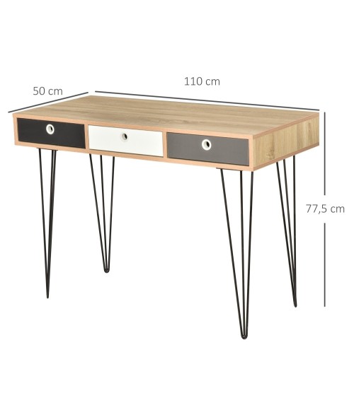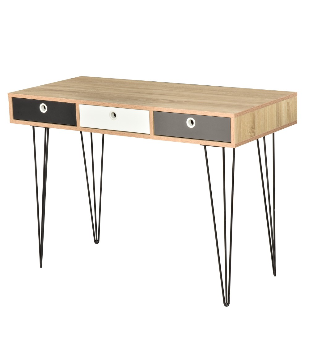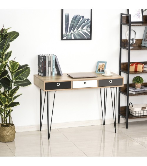 Laissez-vous séduire par le design scandinave de cette splendide table console. Ce meuble est muni de 3 tiroirs tricolores coulissants afin de vous permettre de ranger stylos ou accessoires de bureau, décorations, etc... Fabriquée en métal (pieds épingles noir) et panneaux de particules, cette console vous sera grandement pratique au quotidien.Caractéristiques :- Table console design scandinave mélant avec élégance le métal (pieds épingles noir) et le bois (plateau imitation bois de chêne clair avec veinage et tiroirs tricolores noir, blanc, gris)- 3 tiroirs coulissants pour un rangement plus facile de vos stylos ou autres accessoires de bureau- Poignées tiroirs intégrées de forme ronde : touche de raffinement supplémentaire- Grand plateau idéal afin de ranger vos clefs, placer des décorations, cadres photos, etc...- Conçu et fabriqué à partir de matériaux robustes (métal et panneaux de particules classe E1) pour un usage pérenne- Revêtement des panneaux de particules en mélaminé imitation chêne clair avec veinage- Facile et rapide à monter : notice d'assemblage illustrée fournieSpécifications :- Couleurs principales : noir, imitation bois de chêne clair- Matériaux principaux : métal, panneaux de particules classe E1- Dim. totales : 110L x 50I x 77,5H cm- Dim. rangement interne tiroir : 29,5l x 33,7P x 6H cm- Hauteur pieds : 65 cm- Charge max. recommandée : 40 Kg (au total), 5 Kg (par tiroir)- Livraison éffectuée en un colis- Réf. : 836-241BK