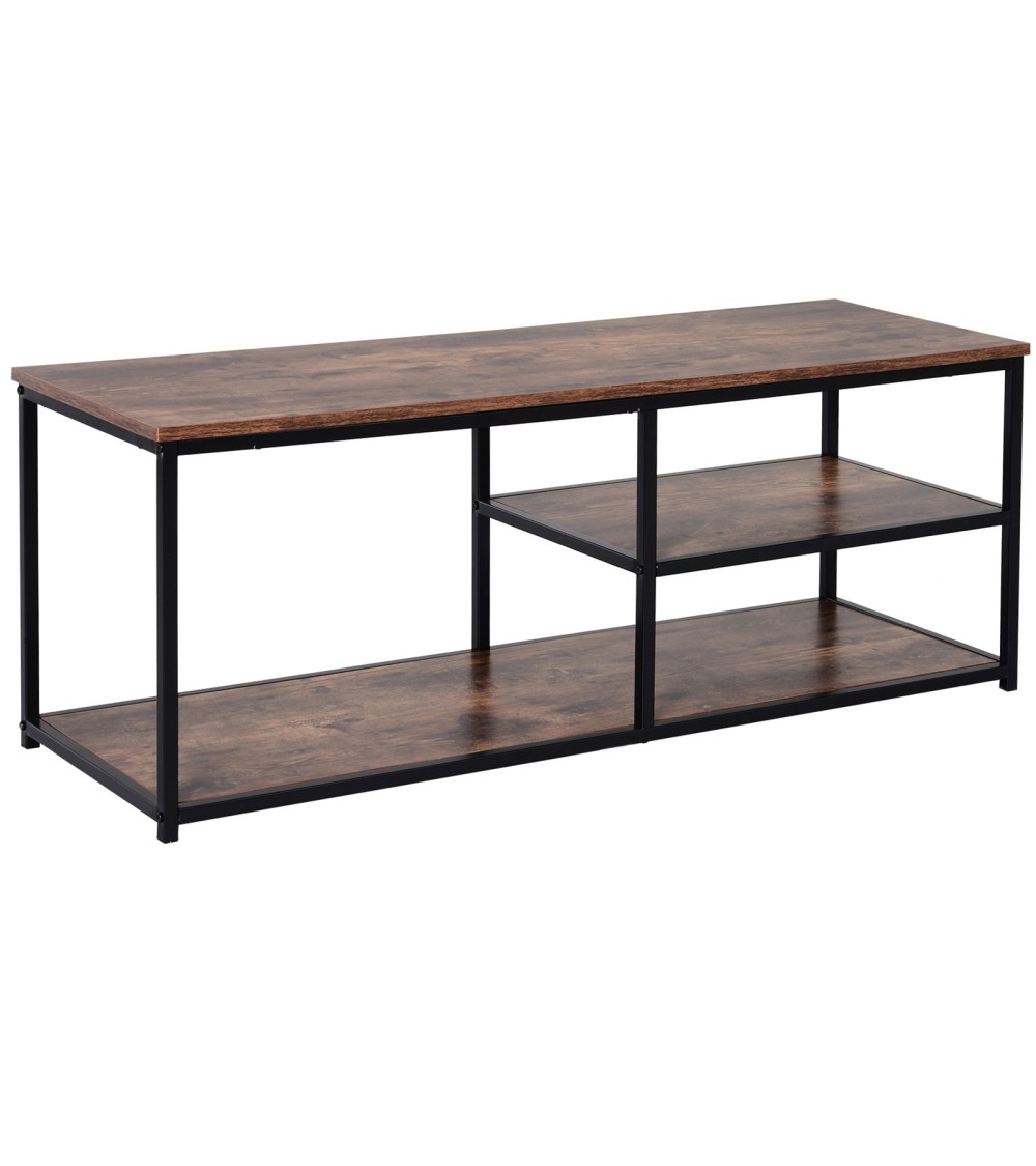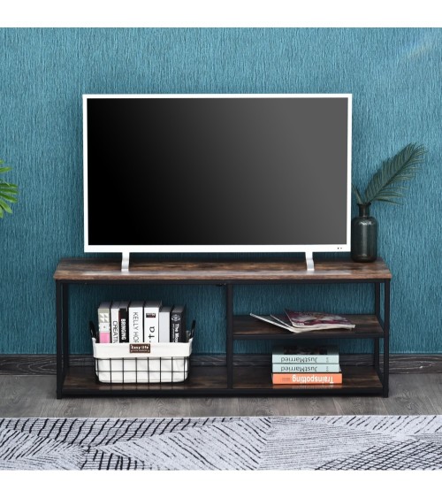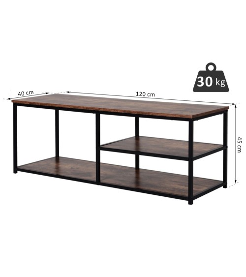 Ce superbe meuble TV style industriel ajoutera une touche d'élégance et d'originalité type loft new-yorkais à votre intérieur. Equipé d'un grand plateau et de 2 étagères, vous pourrez y ranger vos télécommandes, magazines, équipements audio et vidéo, etc... Fabriqué en métal et panneaux de particules, ce meuble TV vous sera grandement pratique au quotidien.Caractéristiques :- Meuble TV style industriel qui ajoutera une touche d'élégance et d'originalité type loft new-yorkais à votre intérieur- Grand plateau + 2 étagères (dont une grande) afin de vous permettre de ranger vos télécommandes, magazines, équipements audio et vidéo, etc...- Excellente finition : dispositif arrière anti-basculement, revêtement mélaminé imitation boisé, patins antidérapants, etc...- Conçu et fabriqué à partir de matériaux robustes (métal et panneaux de particules) pour un usage pérenne- Polyvalent : dimensions permettant d'utiliser ce meuble comme un meuble TV ou même une table basse - Facile et rapide à monter : notice d'assemblage illustrée fournieSpécifications :- Couleurs principales : noir, boisé- Matériaux principaux : panneaux de particules classe E1, métal- Dim. totales : 120L x 40l x 45H cm- Epaisseur panneaux : 1,5 cm- Dim. plateau supérieur : 115,3L x 35,2l cm- Dim. étagère centrale : 54L x 35,2l cm- Hauteur étagère : 18 cm- Charge max. recommandée : 30 Kg (au total), 15 Kg (plateau), 5 Kg (étagère centrale), 10 Kg (étagère inférieure)- Livraison effectuée en un colis- Réf. : 833-719
