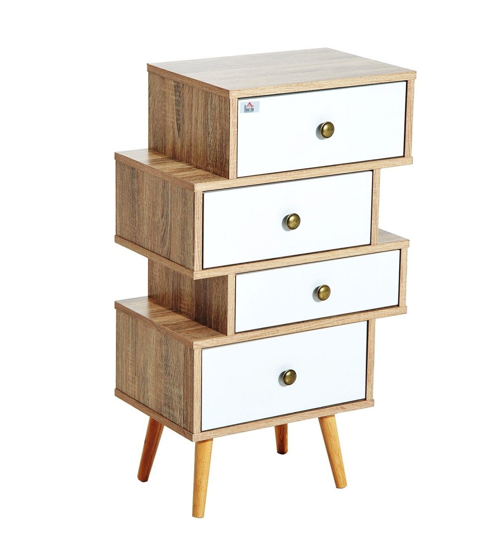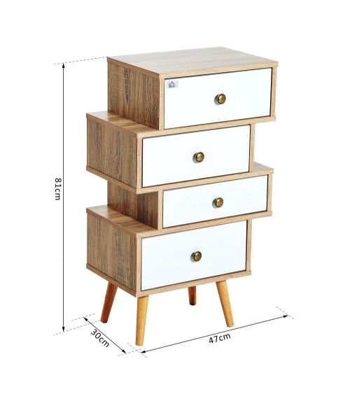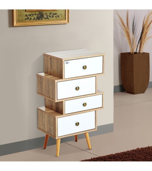 Inspiré des meubles de style scandinave aux lignes épurées, ce chiffonnier à 3 tiroirs se distingue par une construction originale formée de 3 tiroirs pouvant être disposés en quinconce et dont 2 sont pivotants. Ce meuble apportera une touche de raffinement et d'originalité toute particulière à votre intérieur !Caractéristiques : - Meuble commode chiffonnier style scandinave très tendance- Construction originale formée de 4 tiroirs coulissants disposés en quinconce- 4 pieds écartés tendance scandinave en bois massif de hêtre- Boutons de tiroirs imitation laiton pour plus d'élégance- Chiffonnier bicolore bois de chêne et blanc- Parfaite adaptabilité pour intégration dans votre salon, chambre ou entrée Spécifications : - Matériaux principaux : MDF et bois massif de hêtre- Coloris principaux : bois de chêne et blanc- Dimensions totales : 47L x 30l x 81H cm- Dimensions de chaque tiroir (de haut en bas) : 33L x 24l x 10H, 33 x 24 x 10, 33 x 24 x 8 et 33 x 24 x 10H cm- Longueur des pieds : environ 16 cm- Charge max. recommandée : 30 Kg- Réf. : 831-149