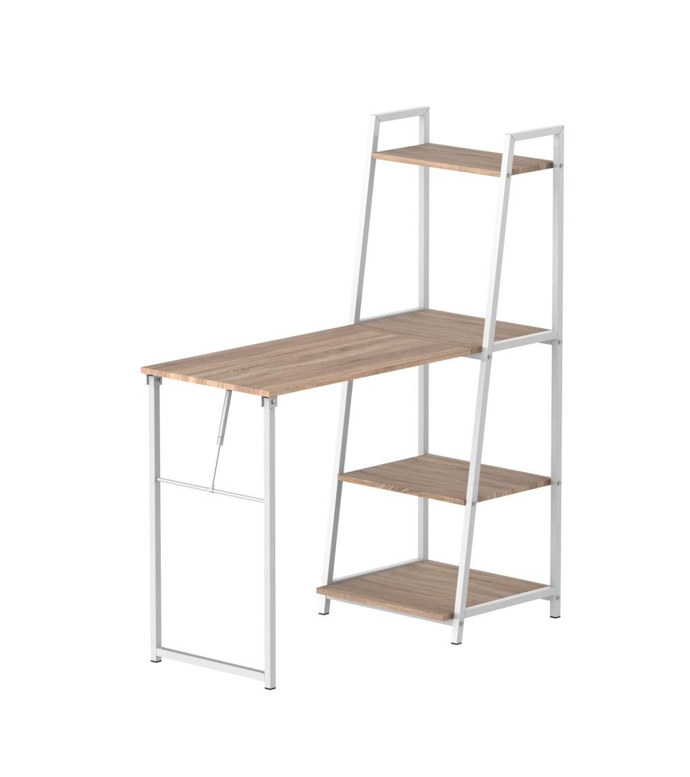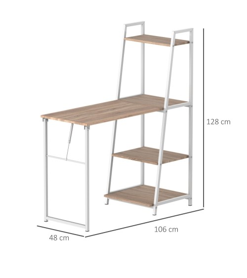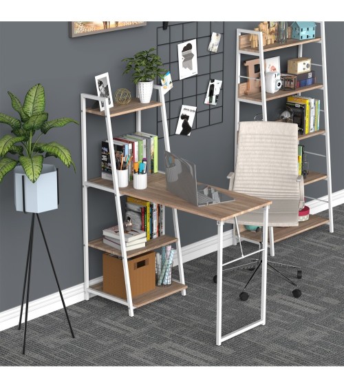 Inspirée par les nouvelles tendances du home staging, ce bureau bibliothèque 2 en 1 (bureau pliable rabattable) sera idéal pour les petits espaces type cuisine, studio ou chambre. Facile à transformer en bureau ou table grâce à son rabat, elle sera d'une grande praticité au quotidien. Sans oublier ses 4 étagères de rangement intégrées idéales pour y placer quelques livres et décorations.Caractéristiques :- Bureau pliable bibliothèque 2 en 1 bicolore chêne clair et blanc : mixité élégante des matériaux (panneaux particules imitation chêne clair et métal blanc)- Bureau pliable rabattable idéal pour les petits espaces type cuisine, studio ou chambre- Équipé d'un plateau de travail/table pratique et doté d'une bibliothèque comprenant 4 étagères- Dépliable et repliable très facilement afin d'économiser de l'espace lorsqu'il n'est pas utilisé- Conception et fabrication de qualité en panneaux de particules robustes classe E1 avec châssis métal- Surface de revêtement en mélaminé très facile d'entretien- Dispositif anti-basculement intégré : stabilité et sécurité optimum d'utilisation- Montage facile à l'aide du manuel d'assemblage illustré fourniSpécifications :- Couleurs : imitation chêne clair, blanc- Matériaux principaux : panneaux de particules classe E1, métal- Dim. totales : 106L x 48l x 128H cm- Dim. plateau : 106L x 44l cm- Dim. étagère supérieure : 44L x 22l x 9,5H cm- Dim. étagère centrale (sous plateau) : 44L x 35l x 37H cm- Dim. étagère inférieure : 44L x 43l x 27H cm- Charge max. recommandée : 20 Kg (au total), 5 Kg (par étagère)- Livraison effectuée en un colis- Réf. : 836-247