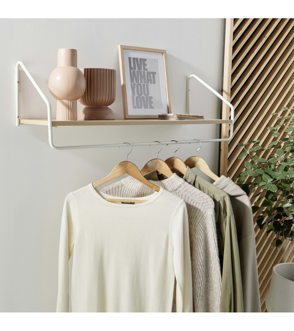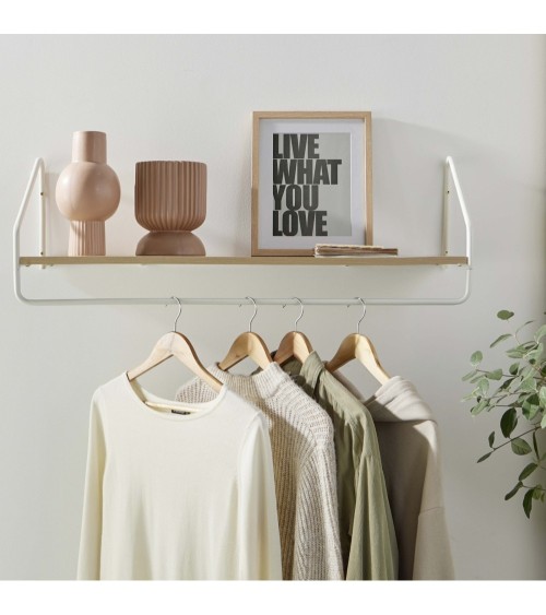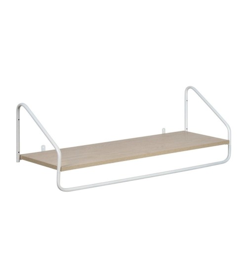 Pratique et esthétique, la penderie étagère murale NELO vous permettra de ranger vos affaires et de suspendre vos vestes et blousons sur des cintres en apportant une touche déco ! L'étagère est fabriquée à partir de panneaux de particules mélaminés (Panneau de particules mélanimé) et se combine parfaitement avec la structure tubulaire en métal blanc. Sobre et solide, la tablette murale a été pensée pour offrir un espace de rangement ouvert supplémentaire vous permettant ainsi d'adapter la disposition de vos affaires. Ce mix matière est idéal pour des pièces chaleureuses comme la chambre ou l'entrée. Ce produit existe aussi en noir ! Cette penderie peut supporter une charge maximale de 10 kg. Vis de fixation murale non fournies.Dimensions : L90 x H30 x P28,5 cm.