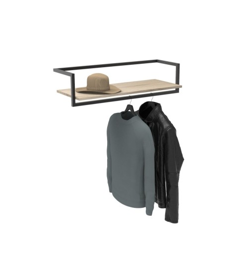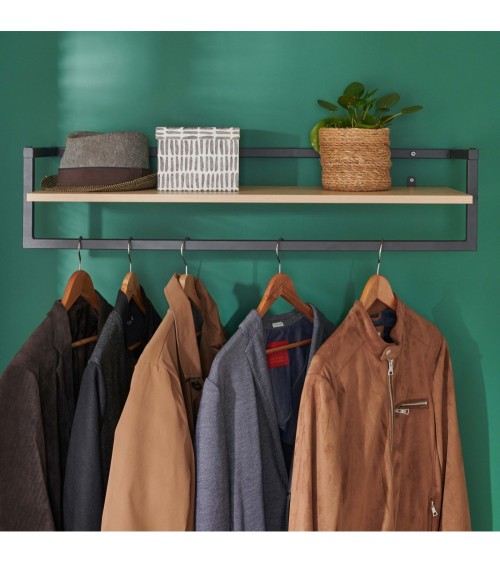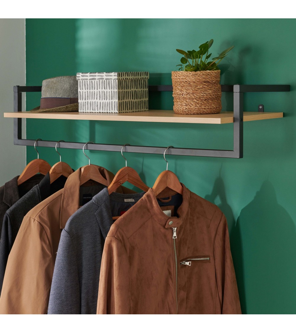 Chic et pratique, la penderie étagère murale ETAN vous permettra de ranger vos affaires et de suspendre vos vestes et blousons sur des cintres en apportant une touche déco ! L'étagère est fabriquée à partir de panneaux de particules mélaminés (Panneau de particules mélanimé) et se combine parfaitement avec la structure métallique noir. Sobre et solide, la tablette murale a été pensée pour offrir un espace de rangement ouvert supplémentaire vous permettant ainsi d'adapter la disposition de vos affaires. Ce mix matière est idéal pour des pièces chaleureuses comme la chambre ou l'entrée. Cette penderie peut supporter une charge maximale de 10 kg. Vis de fixation murale non fournies.Dimensions : L90 x H20 x P34,5 cm (épaisseur de la tablette - 12 mm).
