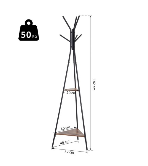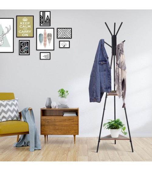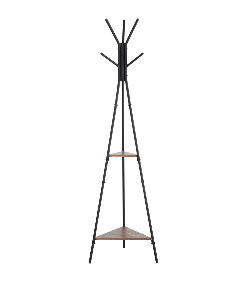 Ce porte-manteau style industriel en forme de branches est à la fois pratique et design dans la maison. Avec ses 6 patères + 2 étagères, vous pouvez y accrocher et y déposer vêtements et autres accessoires. Ce porte-manteau bénéficie en outre d'une grande solidité grâce à sa structure en métal.Caractéristiques :- Porte-manteau style industriel en forme de branches et doté de 2 étagères de forme triangulaire- Equipé de plusieurs patères (x 6) pour accrocher vêtements (manteaux, vestes, etc) et accessoires (sacs à main, foulards, parapluies)- Fabriqué avec des matériaux robustes et durables (métal et panneaux de particules classe E1)- Charge max. recommandée totale : 50 Kg env. (10 Kg par étagère, 3 Kg par patère)- Apporte une touche décorative à la maison (chambres, salon, bureau ou entrée)- Fourni avec un manuel de montage illustré pour un assemblage facile et rapideSpécifications :- Couleurs : noir, boisé- Matériaux principaux : métal et panneaux de particules classe E1- Dim. totales : 46L x 52l x 182H cm- Dim. petite étagère : 40 x 20 cm- Dim. grande étagère : 20 x 82 cm- Diamètre châssis tubulaire : 2 cm- Charge max. recommandée: 50 Kg (au total), 10 Kg (par étagère), 3 Kg (par patère)- Livraison effectuée en un colis- Réf. : 837-029