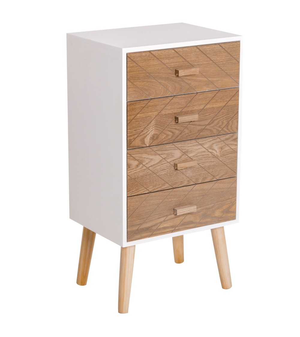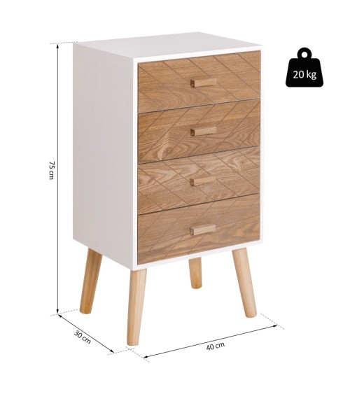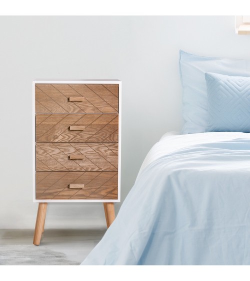 Ajoutez une touche chaleureuse scandinave à votre intérieur en intégrant ce magnifique chiffonnier bicolore blanc et hêtre avec motif graphique. Equipé de 4 tiroirs, vous pourrez y ranger de nombreuses affaires. Caractéristiques : - Chiffonnier design scandinave idéal pour ajouter une touche supplémentaire chaleureuse à votre intérieur- Meuble de rangement compact à intégrer dans l'espace de votre choix : salon, entrée, chambre, bureau, etc...- Style scandinave bicolore hêtre clair et blanc avec pieds effilés et inclinés très élégants- Multi-rangements : 4 tiroirs indépendants, rangement compartimenté très pratique- Matériaux robustes en bois massif de pin et MDF pour un usage pérenne- Motif graphique diagonale sur chaque façade de tiroir (revêtement mélaminé imitation veinage bois de hêtre)- Montage rapide et facile à l'aide du manuel d'assemblage illustré Spécifications : - Couleurs principales : blanc et bois de hêtre- Matériaux principaux : bois massif de pin, MDF- Dimensions totales : 40L x 30l x 75H cm- Dimensions rangement interne tiroirs : 36L x 23l x 11H cm- Charge max. recommandée : 20 Kg- Livraison effectuée en un colis- Réf. : 831-216