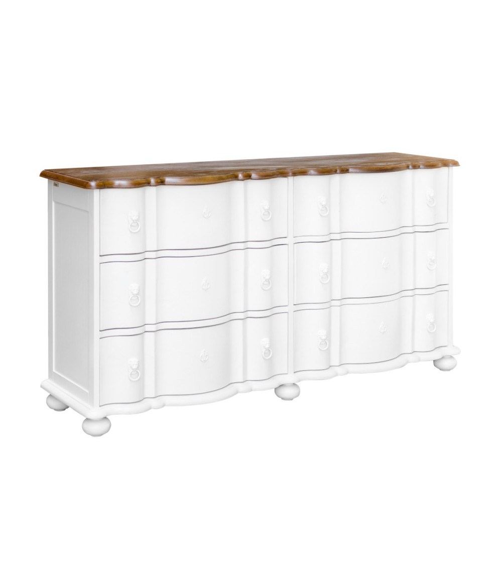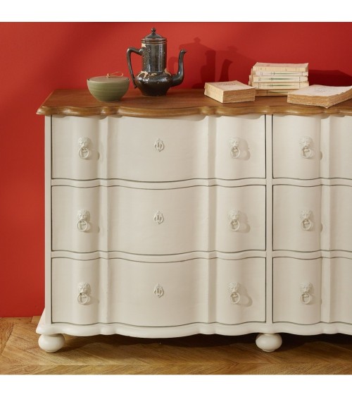 La commode Arbalète donne la note de charme à votre chambre shabby chic. Belles capacités de rangement et jolie patine à l'ancienne à l'effet vieilli.Caractéristiques de la Commode double GOODMOON :Structure en pin massif peint. Plateau en chêne massif plaqué sur médium. Meuble peint et patiné à la main. Poignées en laiton.Couleur : blanche, ou bâti blanc et tiroirs gris ou noire. Finition vernis de protection.Dimensions de la commode double GOODMOON :Longueur : 157 cmHauteur : 84 cmProfondeur : 45 cm (mini 40, maxi 45)Tiroirs : L 70 X H 16 X P 32 (mini 27, maxi 32)Poids : 47 kgLivraison chez vous :La commode GOODMOON est livrée montée.Attention, veuillez vérifier que les ouvertures (portes, escaliers, ascenseurs) permettront le passage du/des colis lors de la livraison.Dimensions et poids du colis :L 166 X H 85 X P 52 cm56 kgConseils d'entretien pour votre meuble :Époussetez fréquemment avec un chiffon propre, sec et non pelucheuxNe pas utiliser de vernis, de cire, de produits huileux, d'alcool, de dissolvant ni de parfumÉvitez d'exposer votre meuble au soleil : une exposition prolongée peut décolorer la finition du meubleNe tirez pas votre meuble si vous le déplacez : soulevez-le afin d'éviter des rayures sur votre sol. Prévenez les livreurs avant qu'ils rentrent chez vous lors de la livraison.À réception de votre meuble, veillez à bien aérer, portes et tiroirs dans une pièce bien ventilée