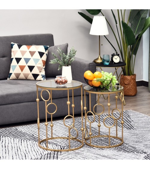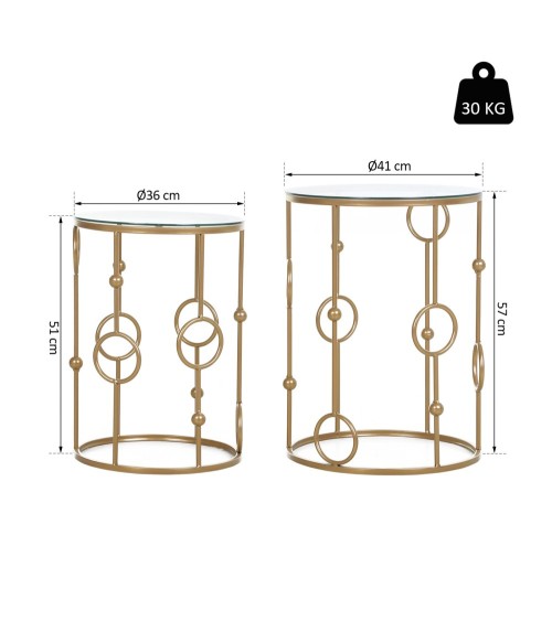 Ces splendides tables gigognes design style art déco apporteront une touche d'élégance supplémentaire à votre intérieur. Leur taille compacte et leur légèreté vous permettront de les déplacer à votre guise et de les utiliser suivant vos besoins : table basse, bout de canapé, guéridon, etc...Caractéristiques :- Lot de 2 tables gigognes rondes design style art déco- Idéal pour ajouter une touche d'originalité et d'élégance supplémentaire à votre intérieur- Formes géométriques rondes, lignes épurées : véritable atout charme- Plateaux Ø 41 et Ø 36 cm, permet de poser magazines, journaux, télécommandes, verres, etc...- Tables compactes et légères, facile à déplacer suivant vos besoins et envies : table basse, bout de canapé, guéridon, etc...- Tables empilables : rangement facile et pratique- Conçues et fabriquées à partir de matières résistantes (métal et verre trempé 5 mm) pour un usage pérenne- Montage ultra-rapide, installation et utilisation quasi-immédiate !Spécifications :- Coloris : doré- Matériaux principaux : métal, verre trempé- Dim. grande table : Ø 41 x 57H cm- Dim. petite table : Ø 36 x 51H cm- Épaisseur verre trempé : 5 mm- Ø châssis tubulaire : 1,3 cm- Charge max. recommandée : 30 Kg- Livraison effectuée en un colis- Réf. : 833-674