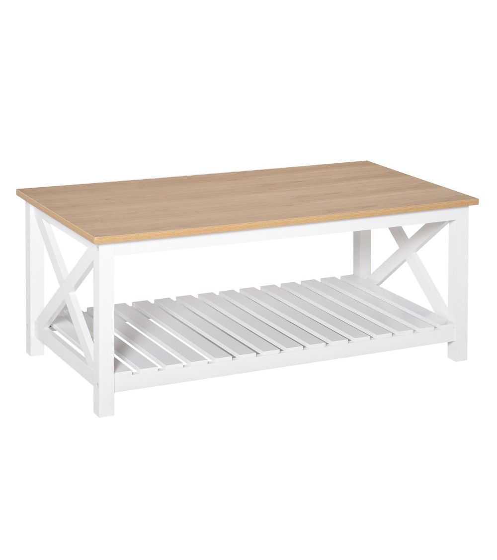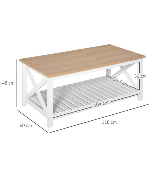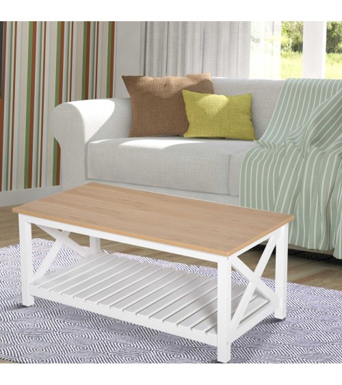 Le style cosy chic de cette table basse rectangulaire rendra votre salon plus raffiné et plus élégant. Ce meuble vous permet de ranger plus facilement vos affaires grâce à son étagère sous-jacente. La structure en MDF classe E1 confère une certaine solidité à la table pour un usage pérenne en tout confort.Caractéristiques :- Table basse rectangulaire de style cosy chic idéal pour ajouter une touche chaleureuse supplémentaire à votre intérieur- Jolie mixité des couleurs et formes : chêne clair et blanc, étagère à lattes, extrémités châssis latéral en croix- Equipée d'un grand plateau et d'un vaste espace de rangement sous-jacent (grande étagère)- Fabriquée à partir de MDF classe E1 pour une solidité accrue- Surface en mélaminé facile à entretenir- Manuel d'instructions illustrées fourni : montage facile et rapideSpécifications :- Couleurs : blanc, chêne clair- Matériaux principaux : MDF classe E1- Dim. totales : 116L x 60l x 48H cm- Dim. étagère : 104L x 55,5l cm- Hauteur étagère jusqu'au sol : 31 cm- Hauteur pieds : 6 cm- Charge max. recommandée : 22,5 Kg- Livraison effectuée en un colis- Réf. : 833-895