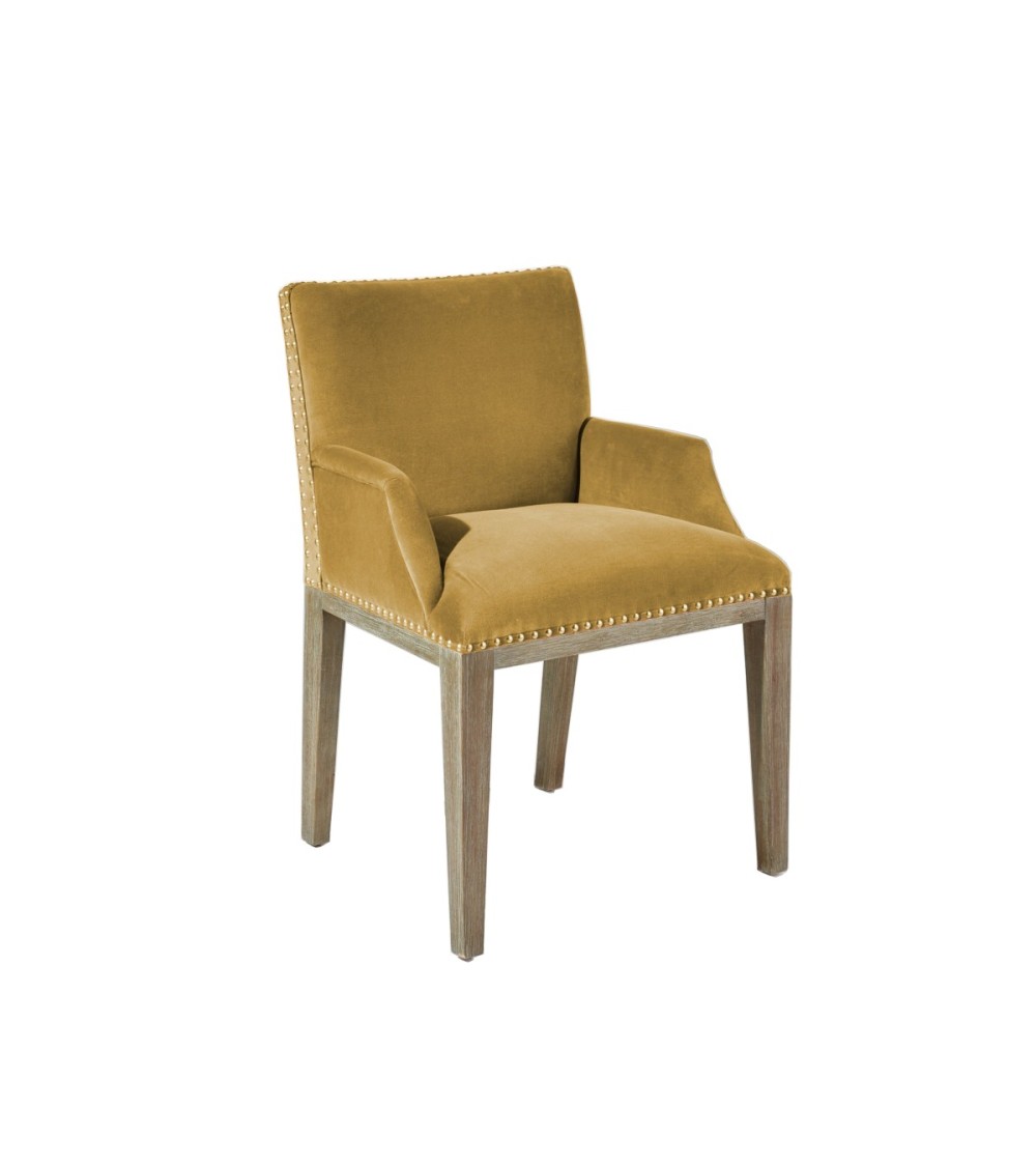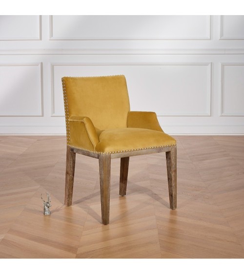 KENZA - Fauteuil de table en velours et en bois clouté jaune moutarde